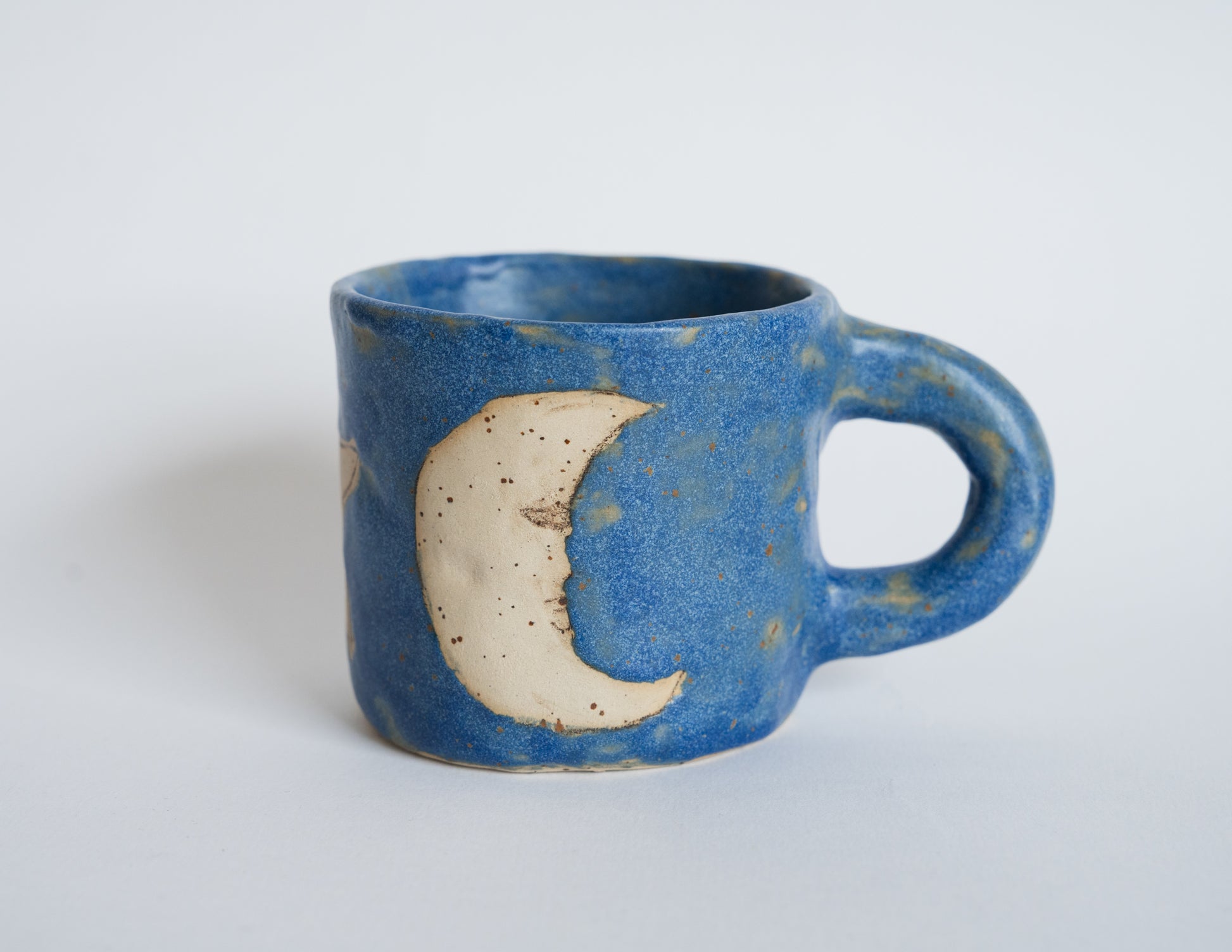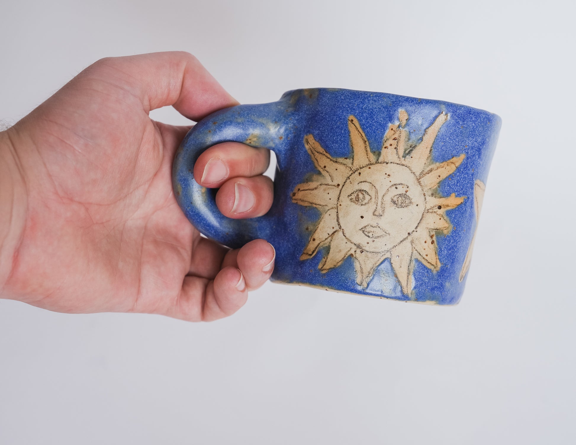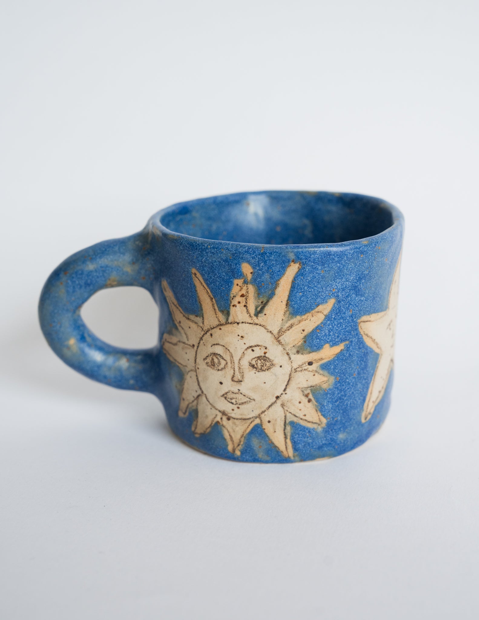 A softly rounded mug handbuilt from speckled stoneware, glazed in a smooth, deep blue satin finish. Hand-drawn celestial motifs, the sun, the moon, and the star, appear together in a single night sky. Each design is sketched in underglaze pencil, then traced in wax before firing, making every mug truly one of a kind.