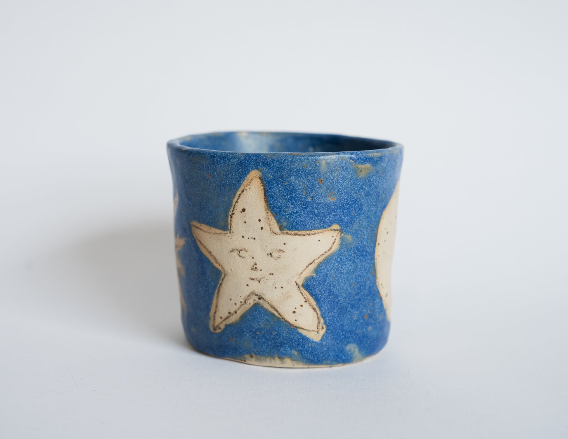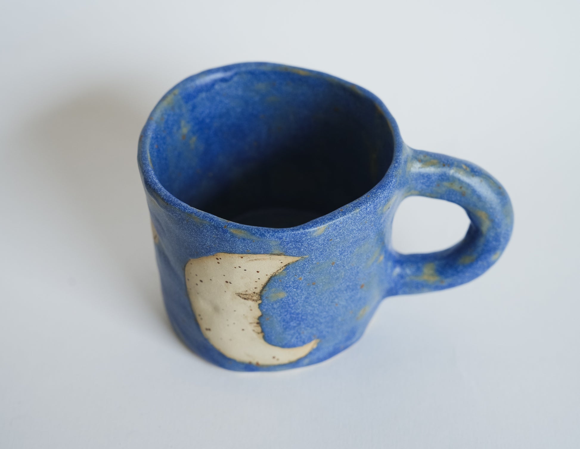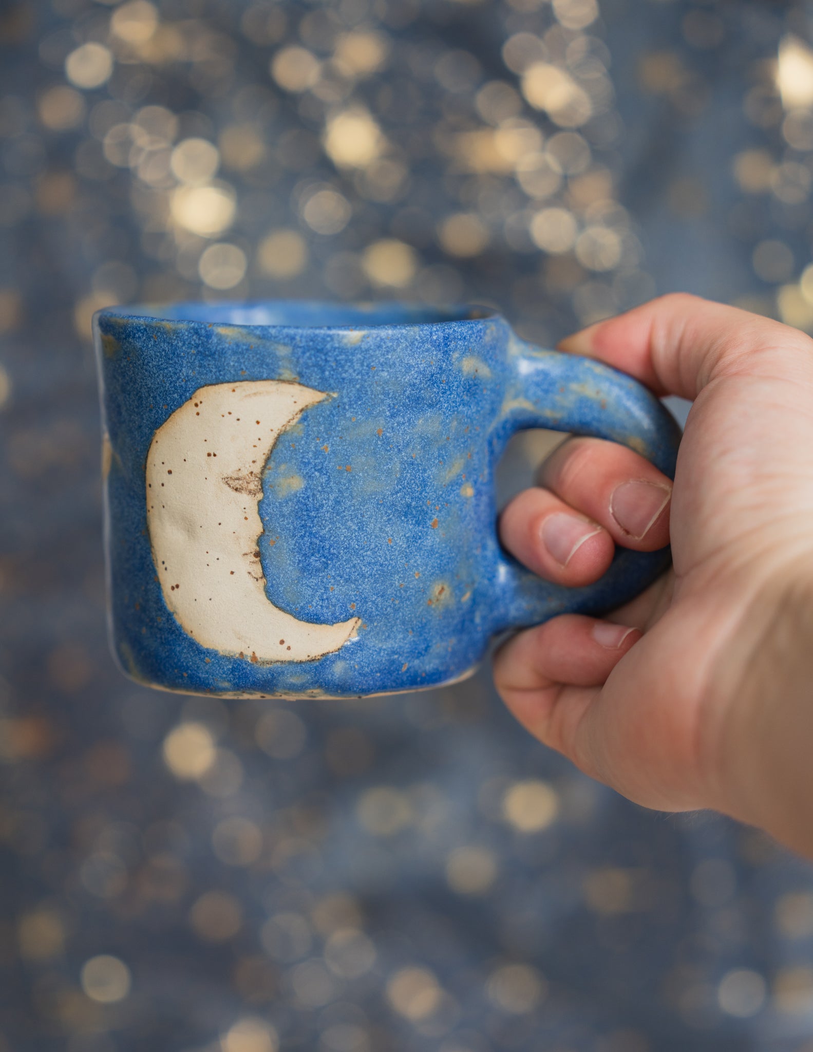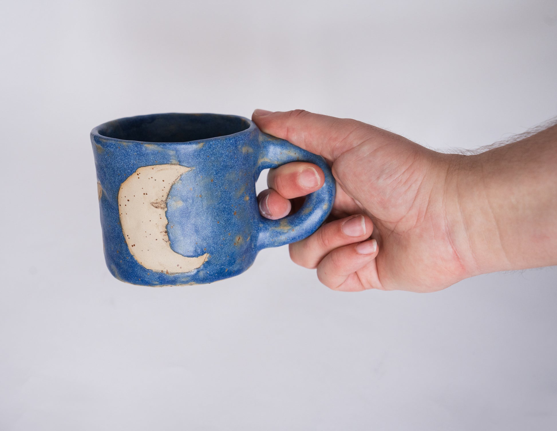 A softly rounded mug handbuilt from speckled stoneware, glazed in a smooth, deep blue satin finish. Hand-drawn celestial motifs, the sun, the moon, and the star, appear together in a single night sky. Each design is sketched in underglaze pencil, then traced in wax before firing, making every mug truly one of a kind.