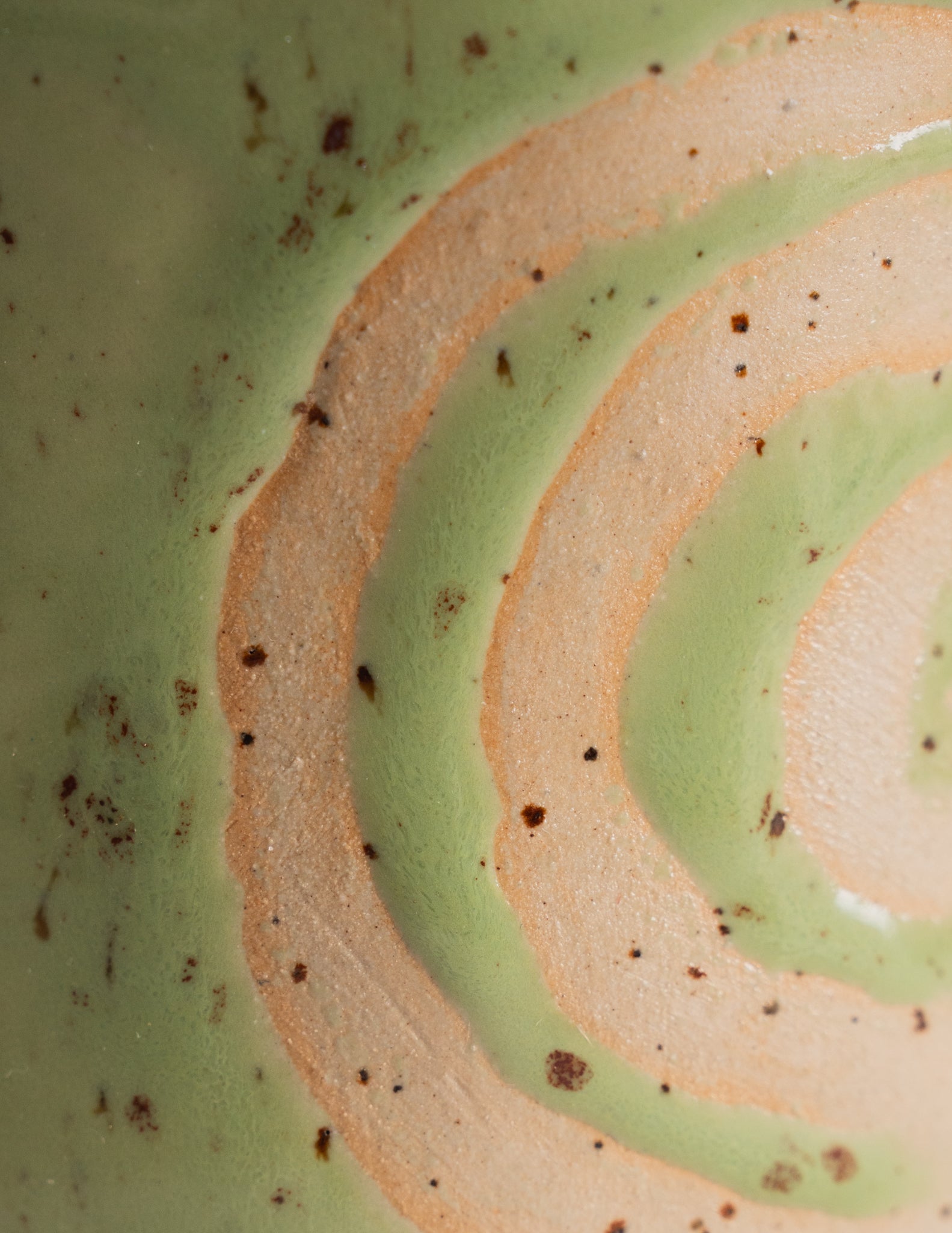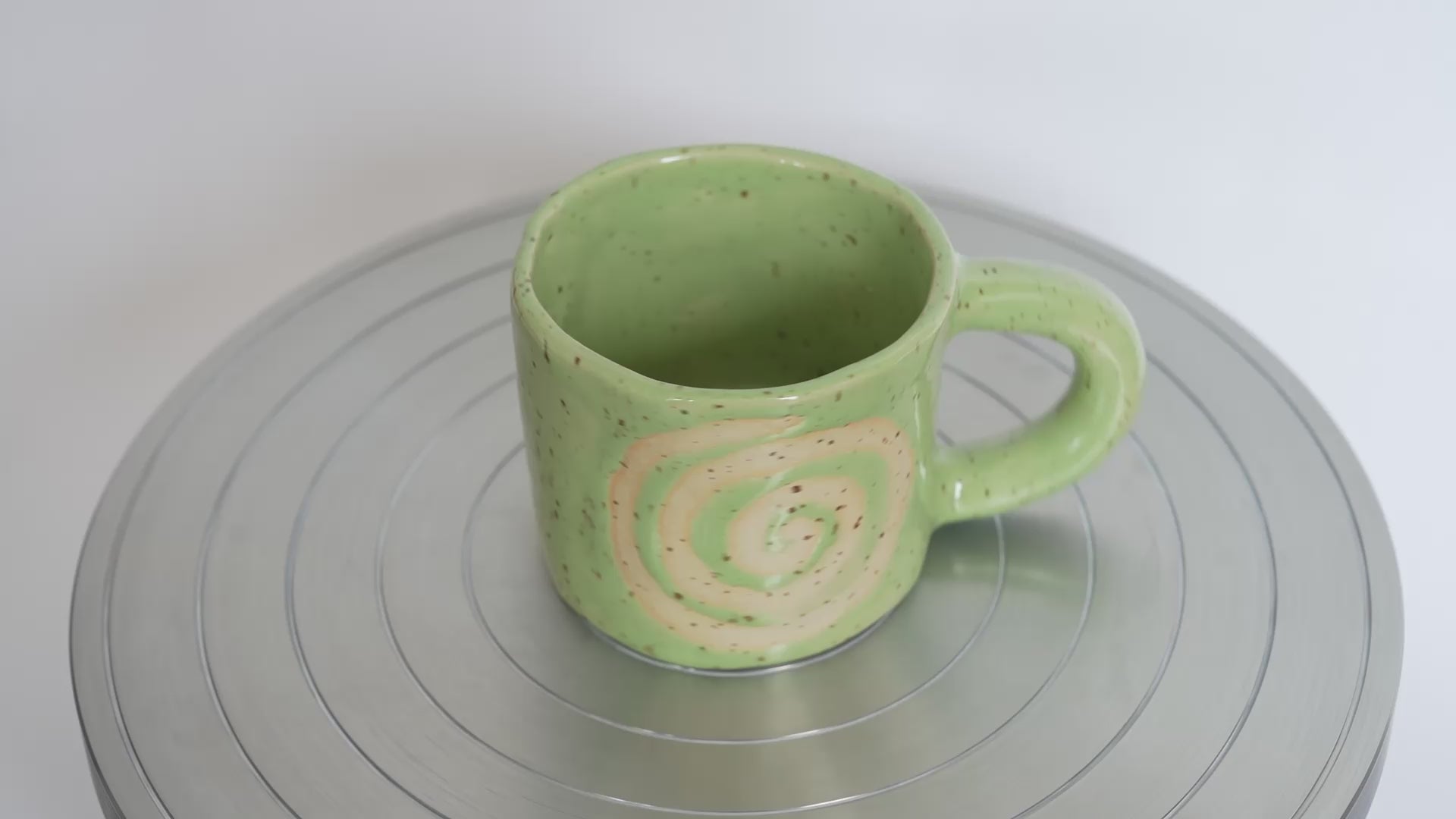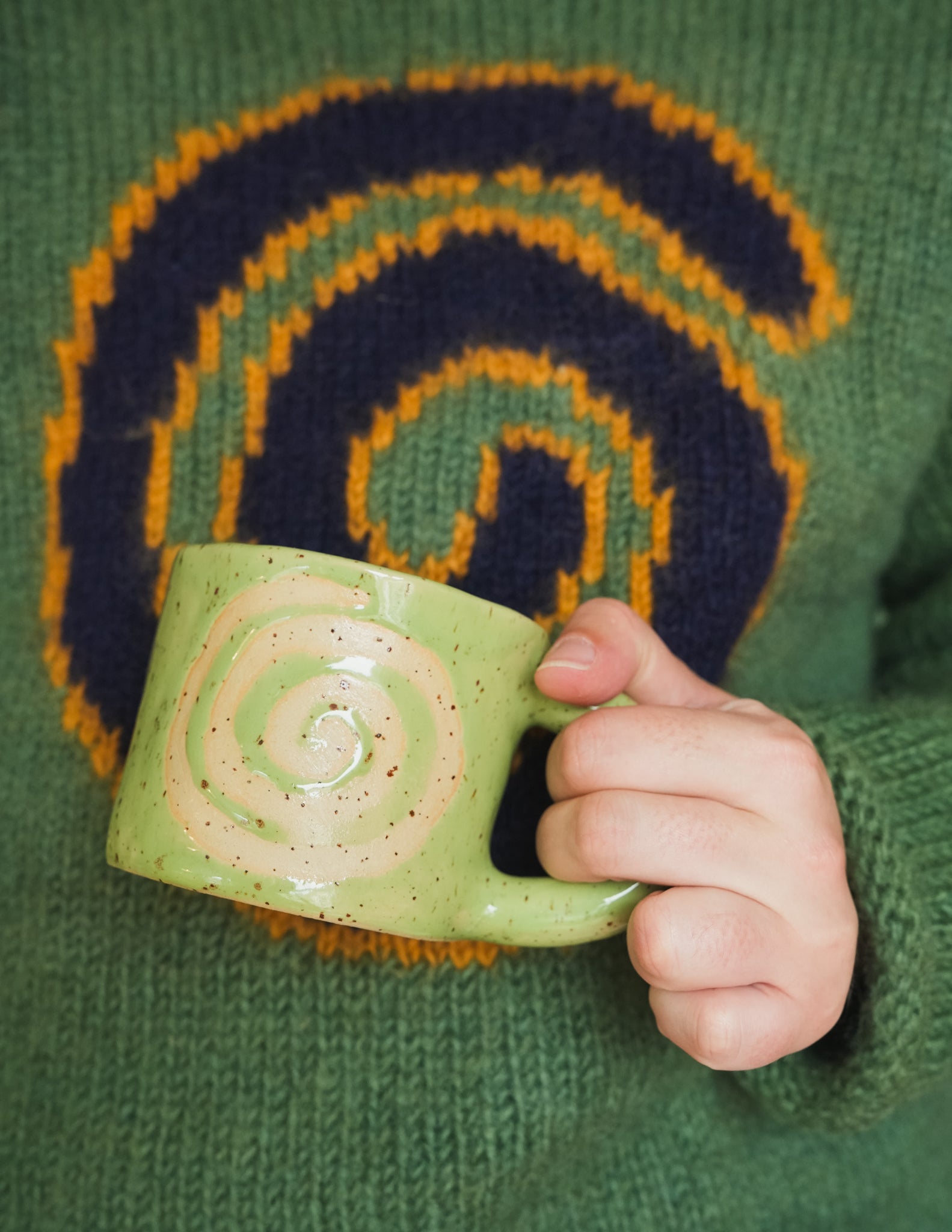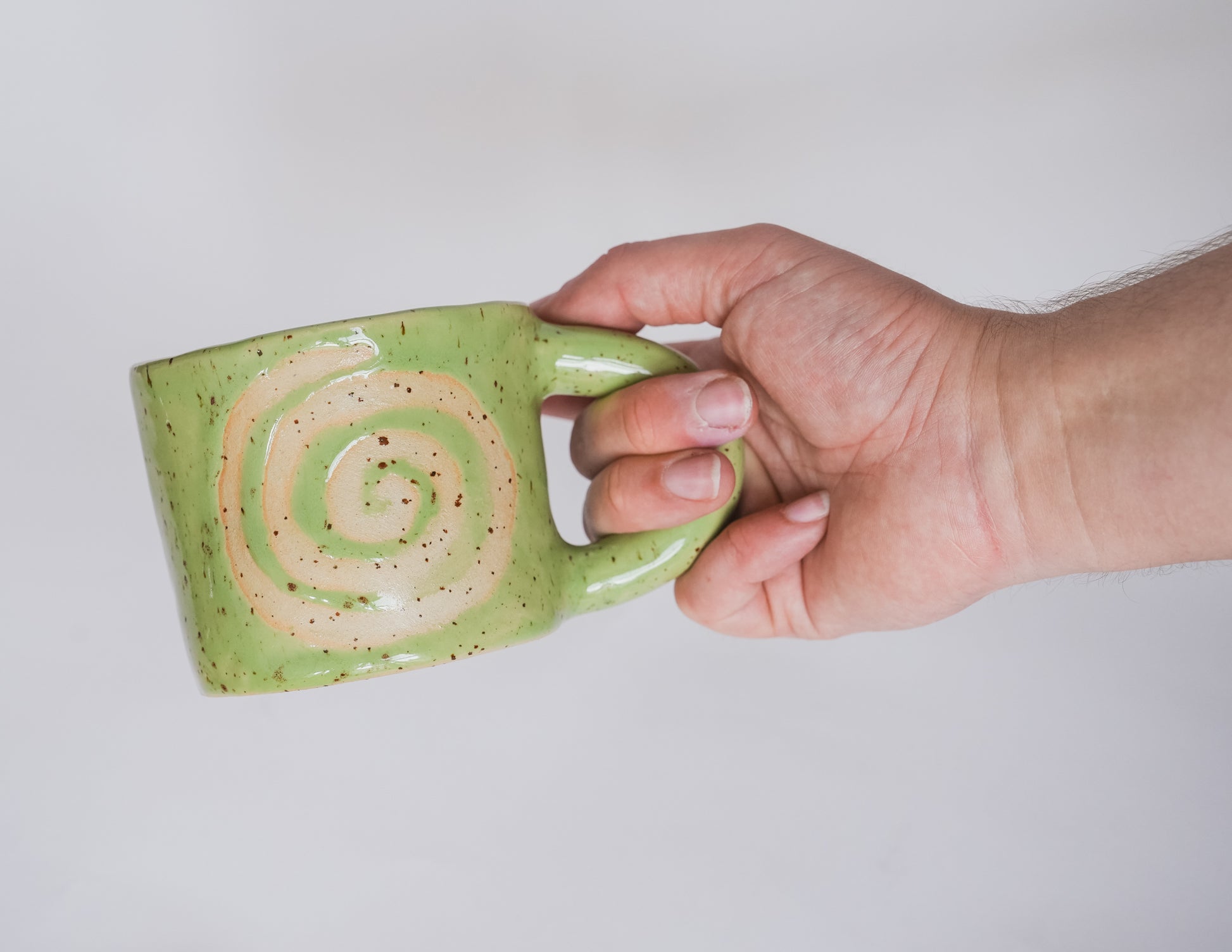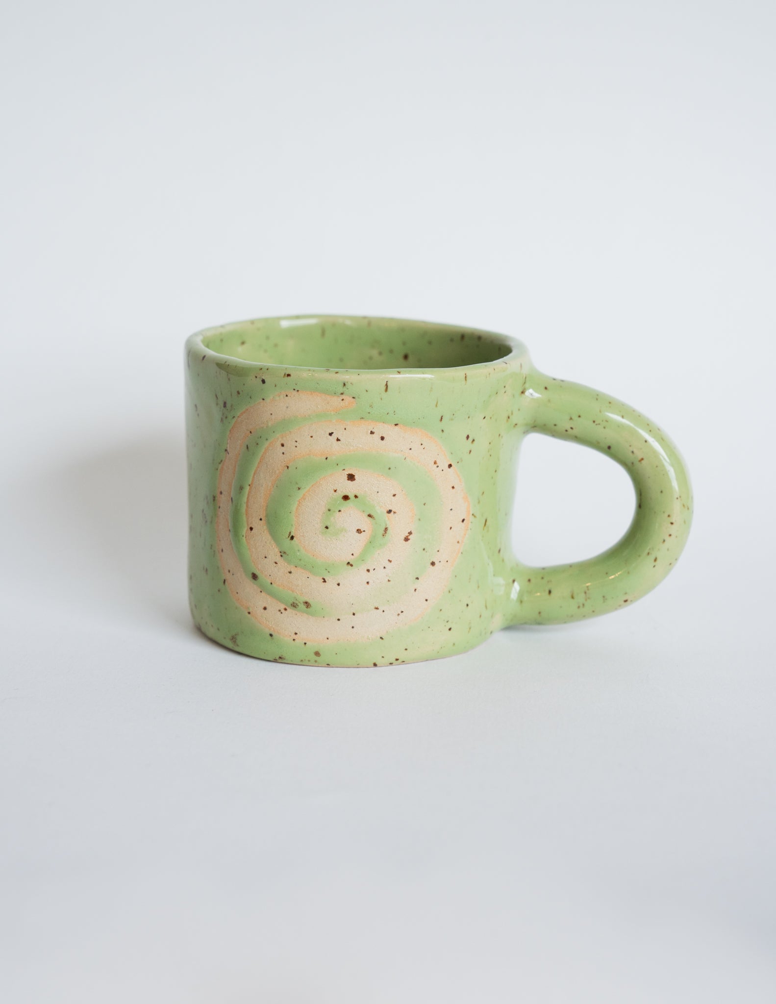 A softly rounded mug glazed in ultra-glossy green, revealing a spiral in speckled beige clay. Inspired by Lammas rituals and hypnotic spirals, each swirl is drawn freehand with wax, then glazed over to create a sense of gentle motion and individuality. This mug is made for slow mornings, quiet afternoons, or evening rituals.