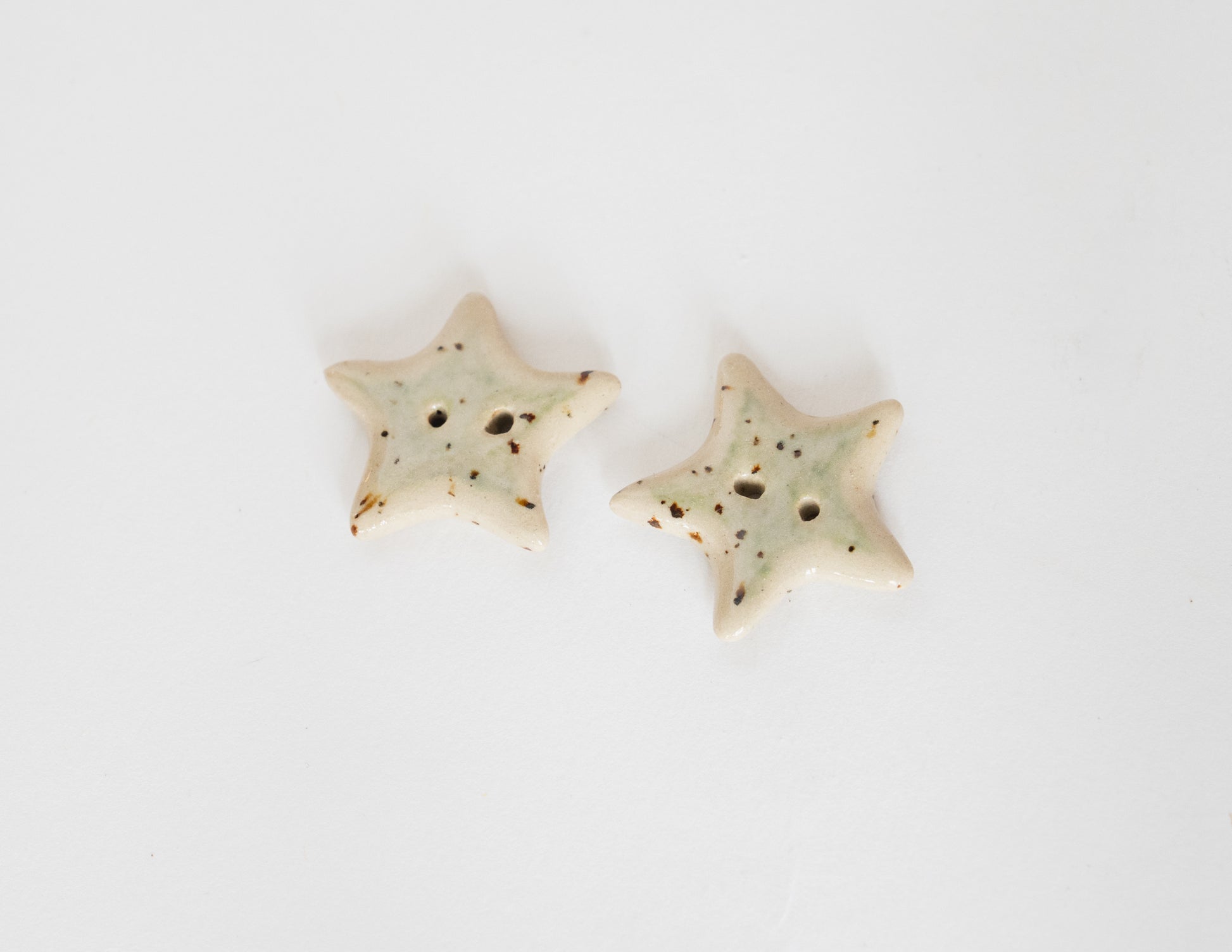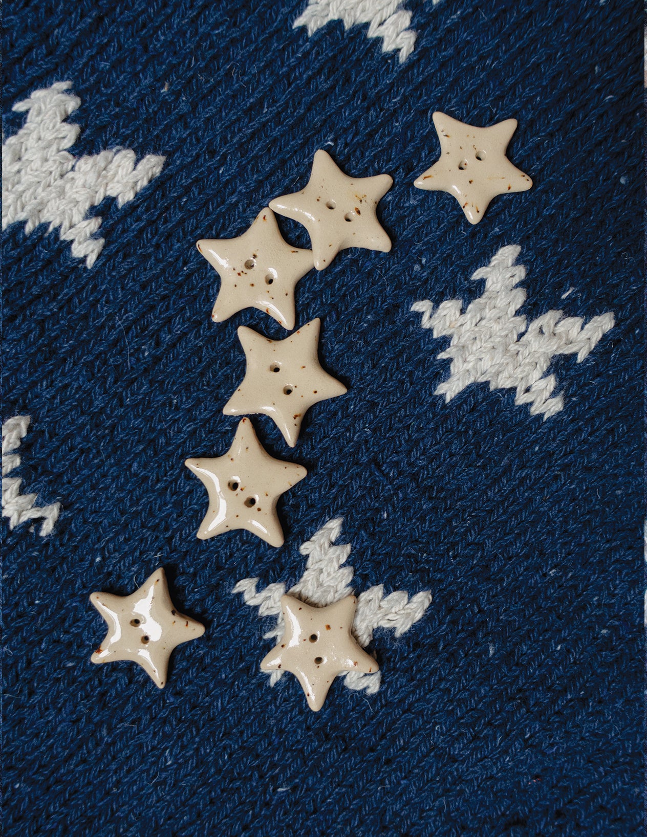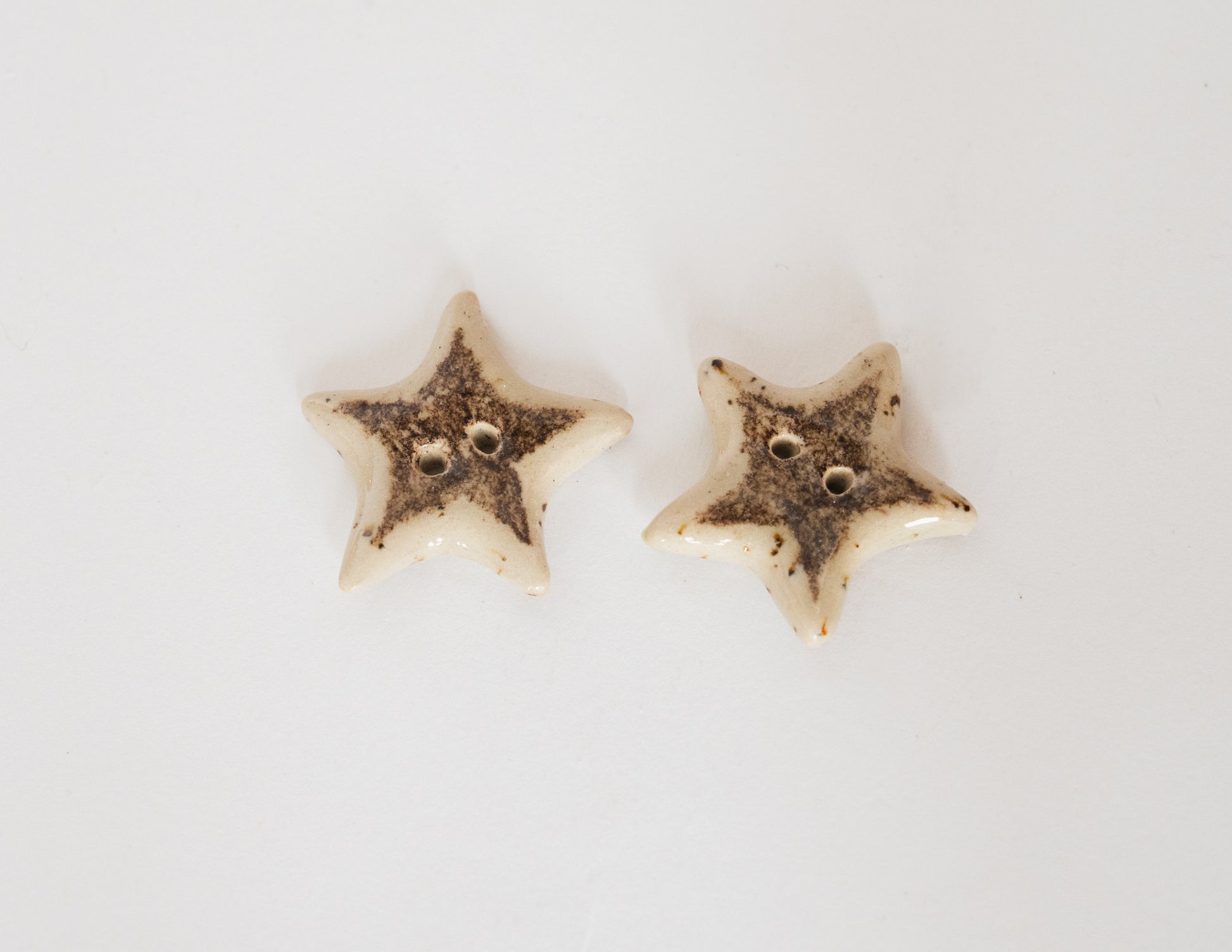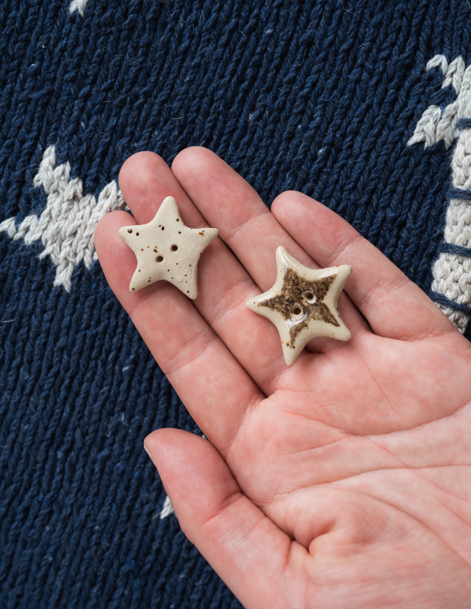 A five-pointed star glazed in glossy clear over speckled beige stoneware. Choose between classic transparent or playful underglaze pencil drawings. Slight variation in curve, texture, and spacing makes each one quietly distinct. Perfect for handknit cardigans, heirloom garments, or little charm embellishments.
