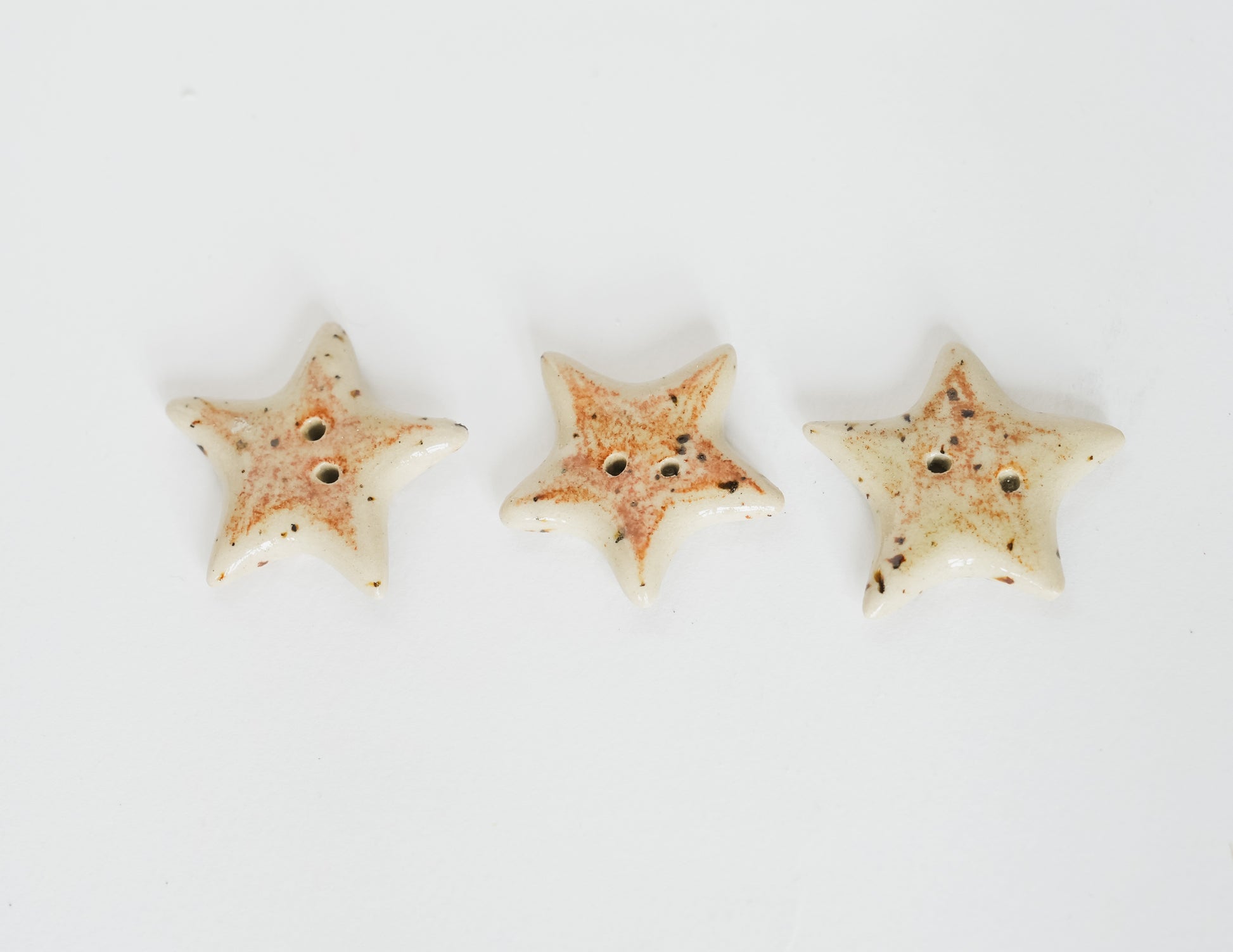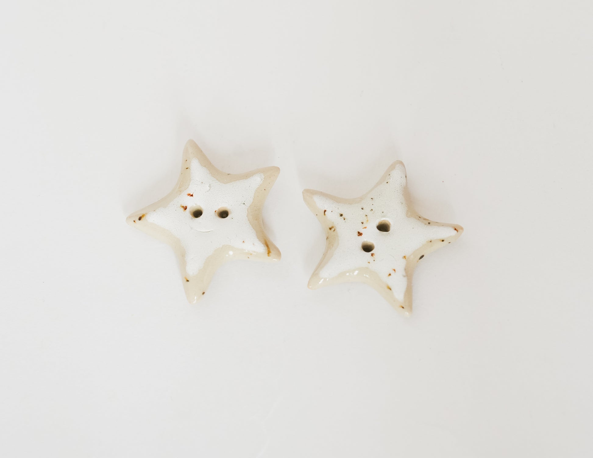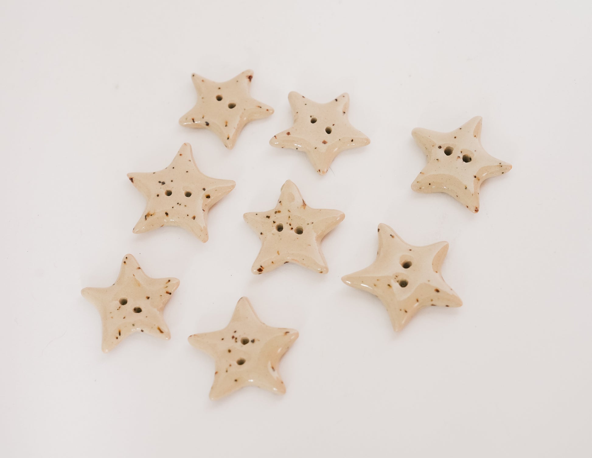 A five-pointed star glazed in glossy clear over speckled beige stoneware. Choose between classic transparent or playful underglaze pencil drawings. Slight variation in curve, texture, and spacing makes each one quietly distinct. Perfect for handknit cardigans, heirloom garments, or little charm embellishments.