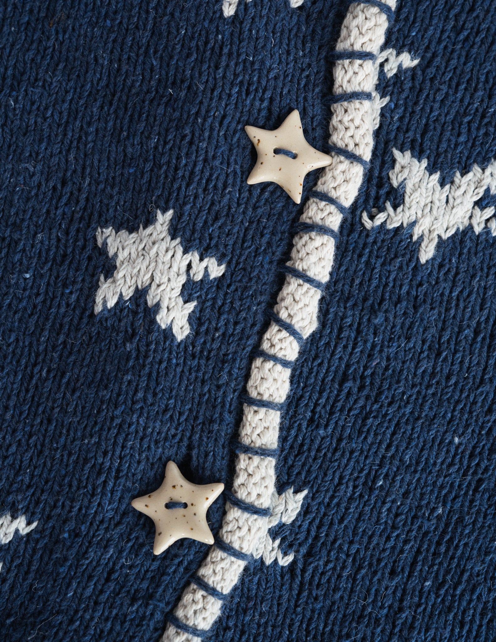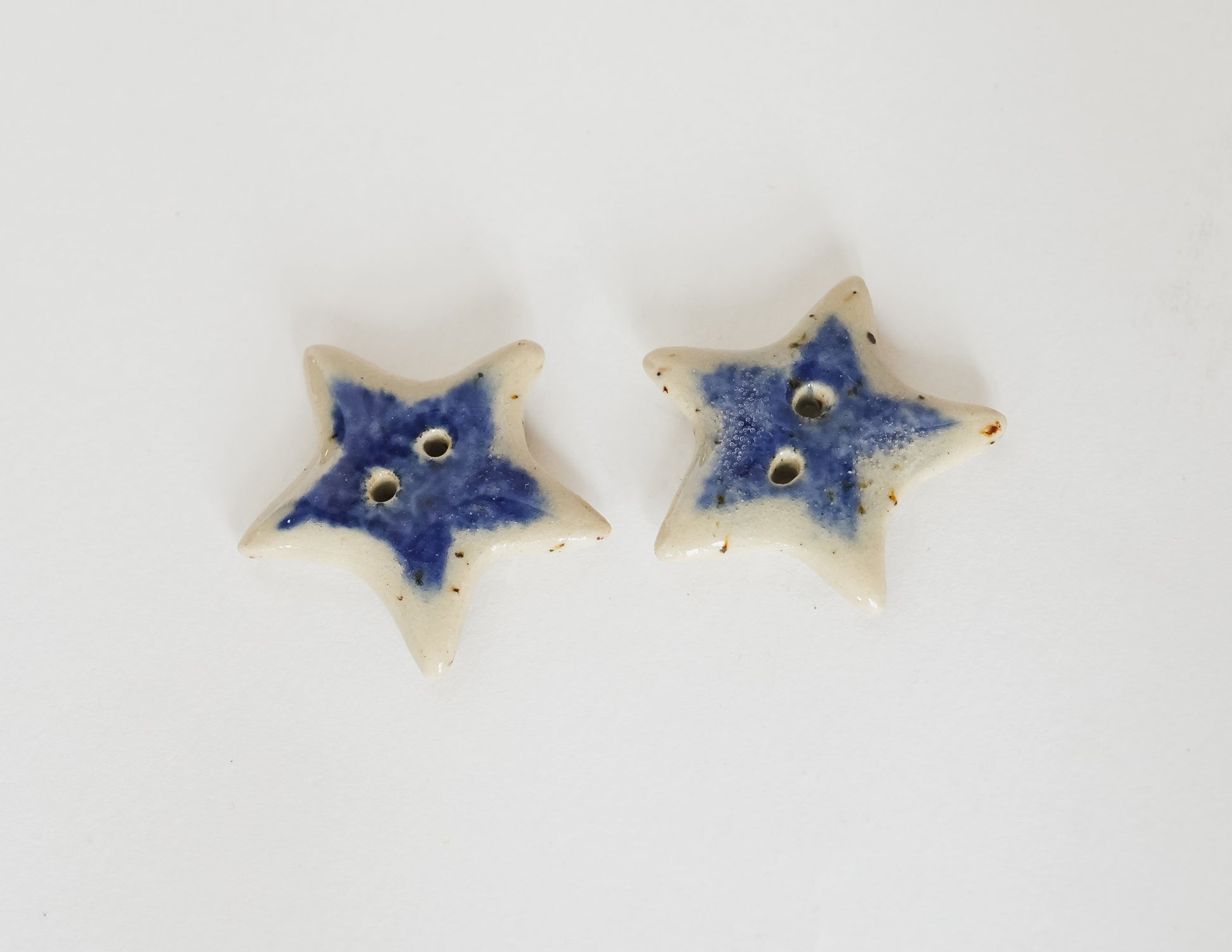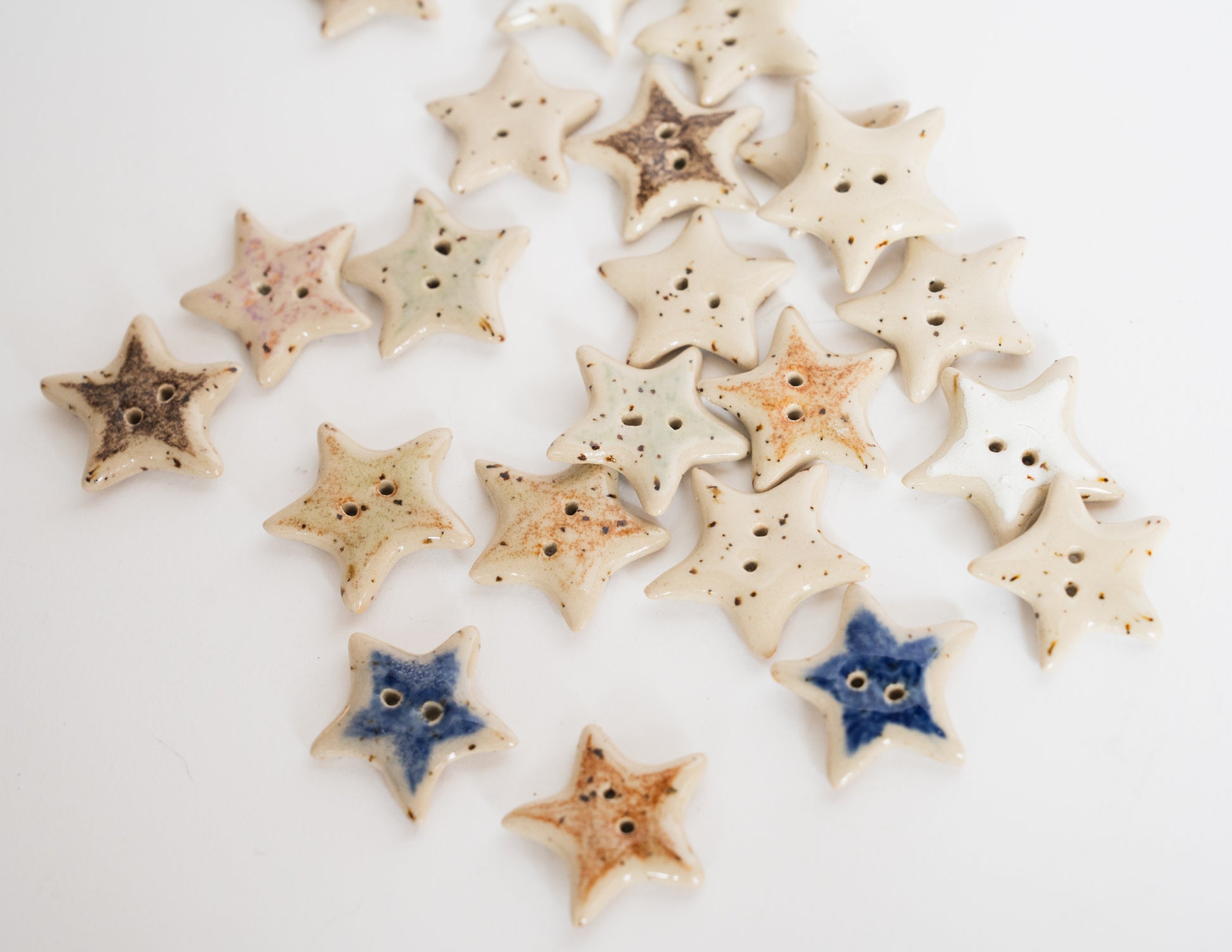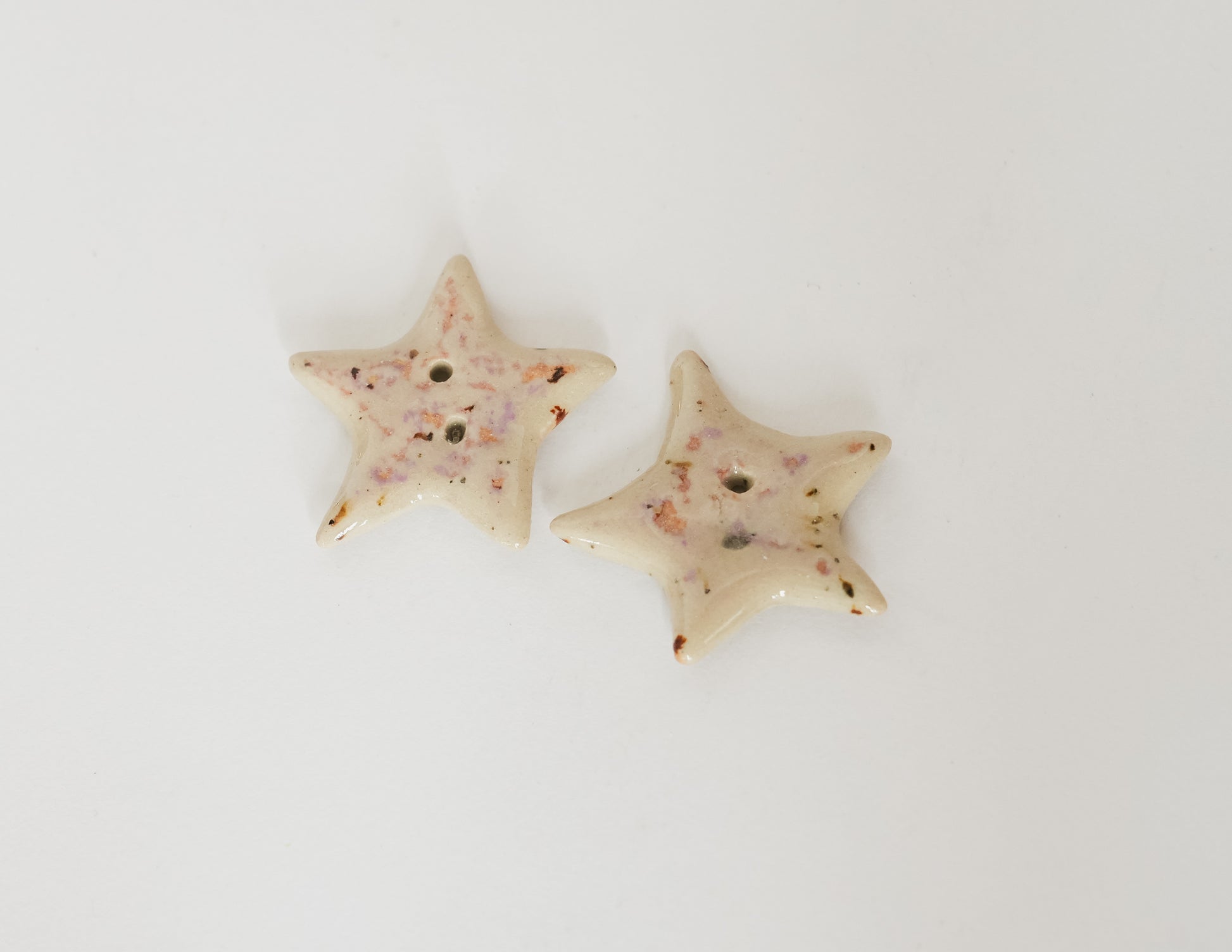 A five-pointed star glazed in glossy clear over speckled beige stoneware. Choose between classic transparent or playful underglaze pencil drawings. Slight variation in curve, texture, and spacing makes each one quietly distinct. Perfect for handknit cardigans, heirloom garments, or little charm embellishments.