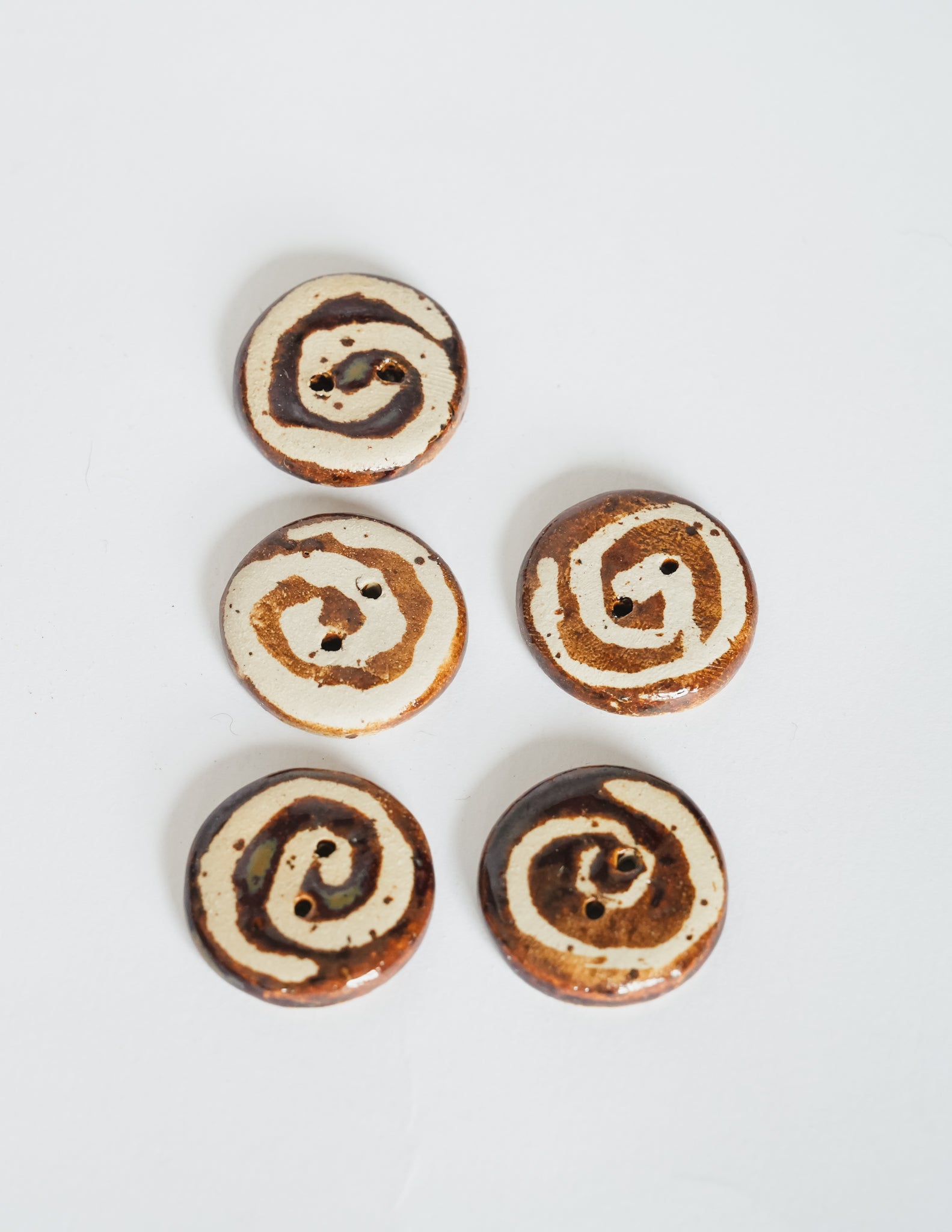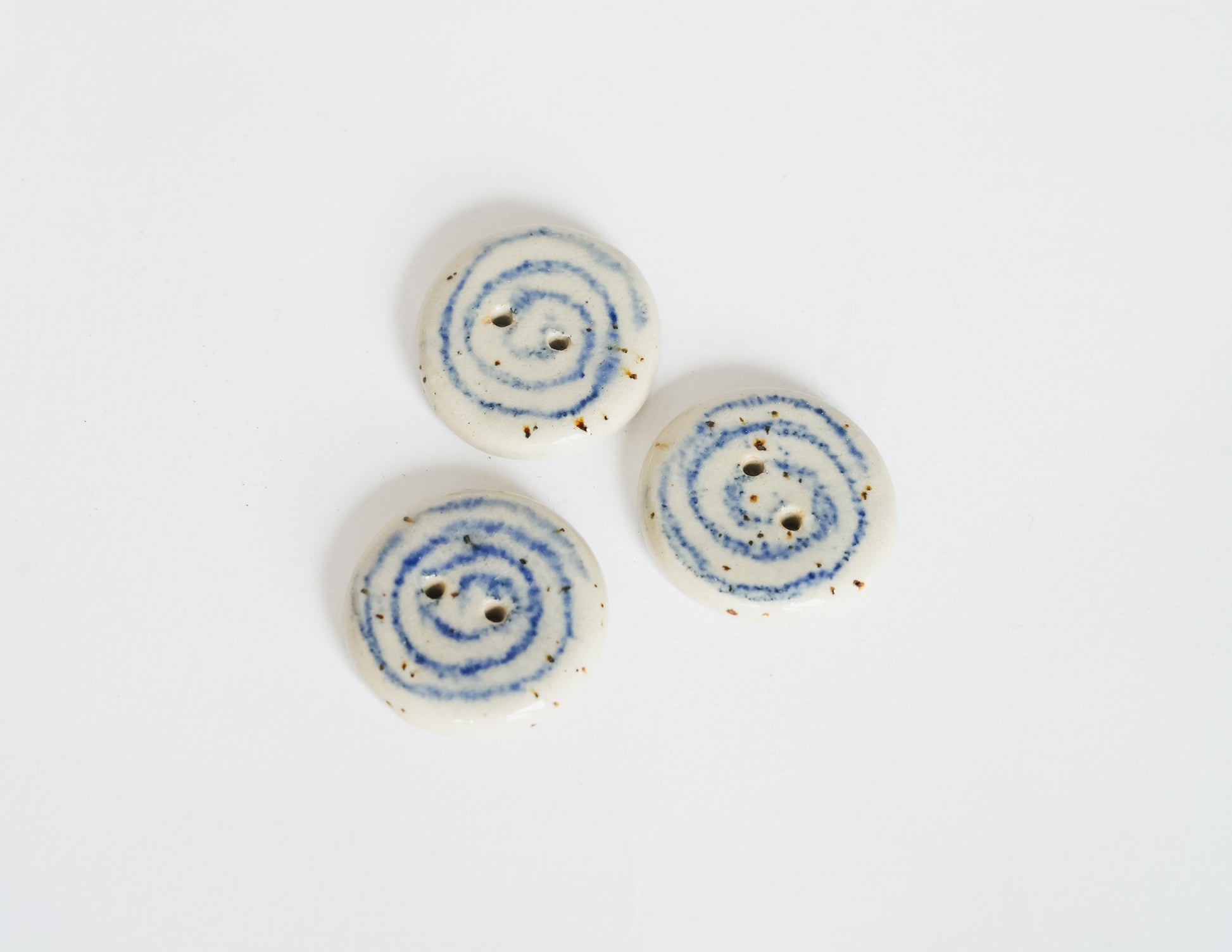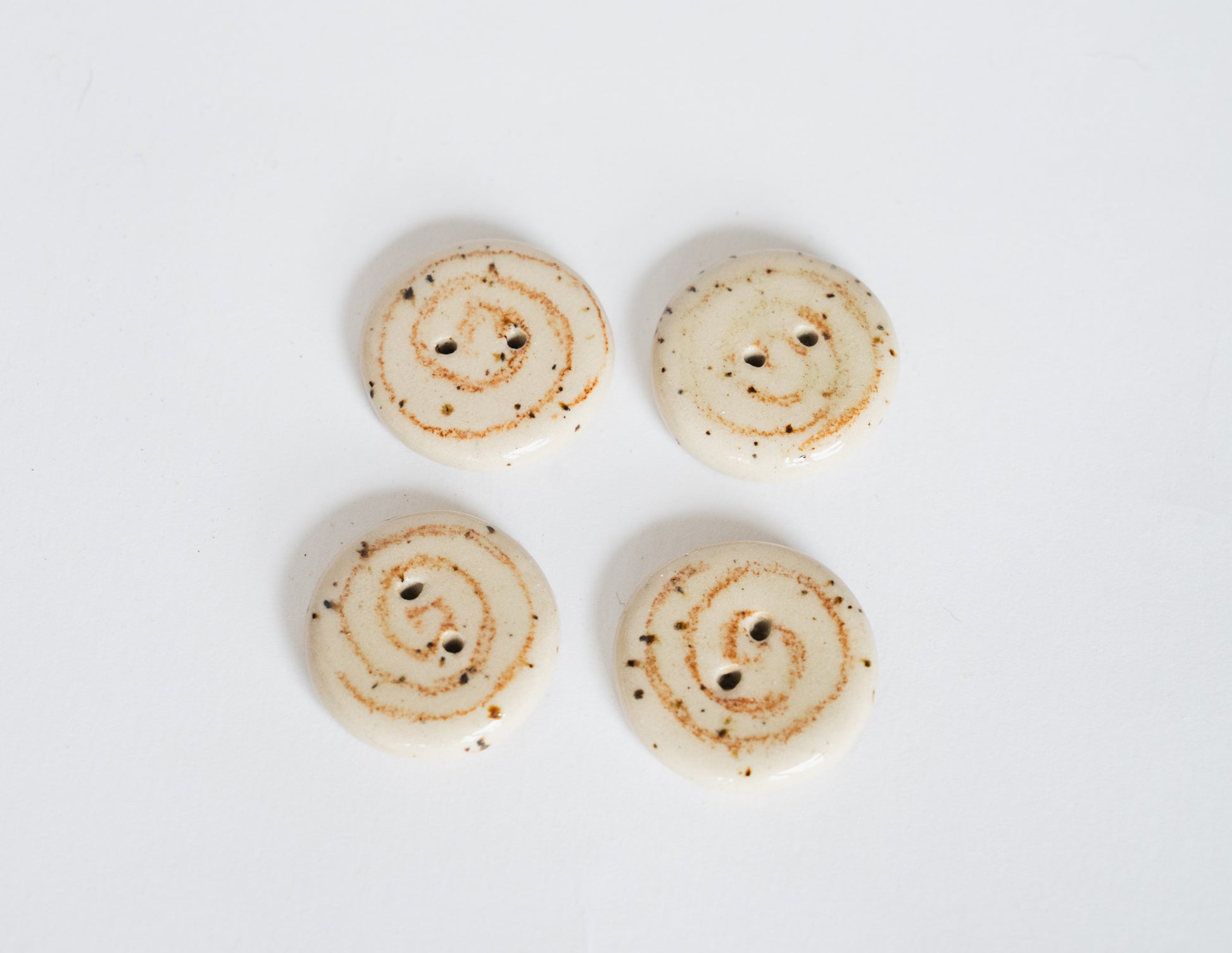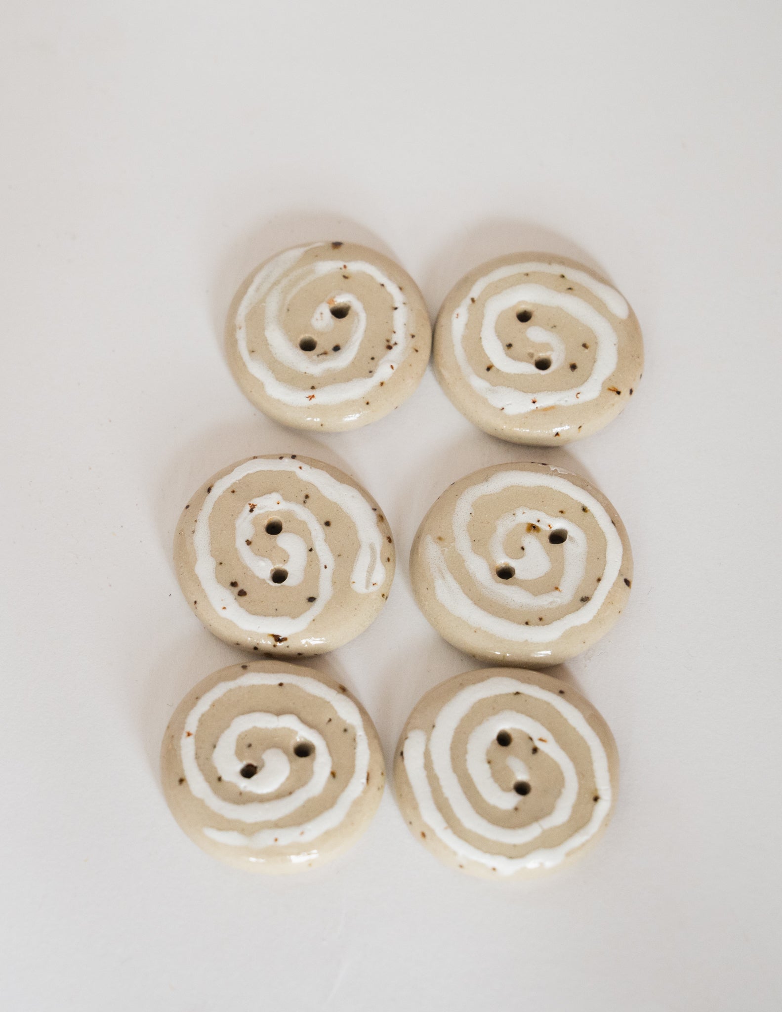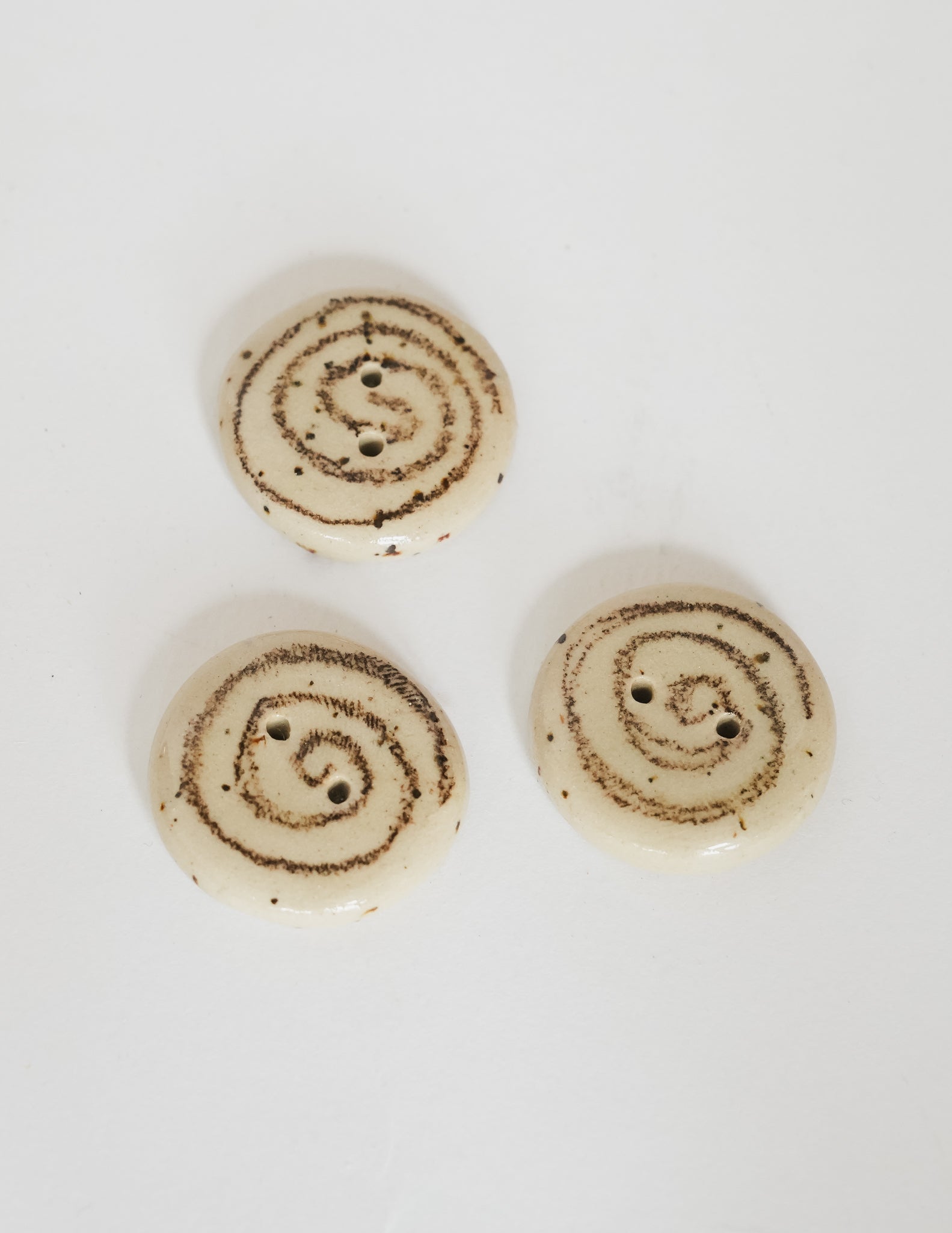 A classic round button with a hand-drawn swirl, glazed in clear over speckled beige stoneware. Each swirl carries subtle differences in rhythm and line. A soft accent for cardigans, project bags, or delicate closures.