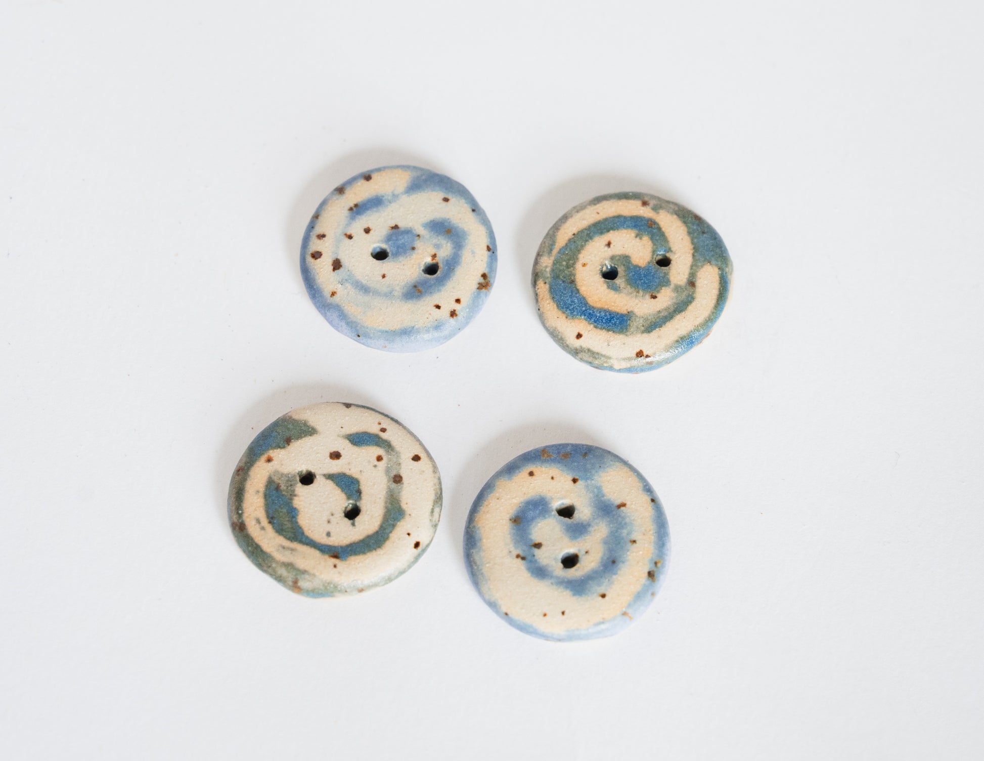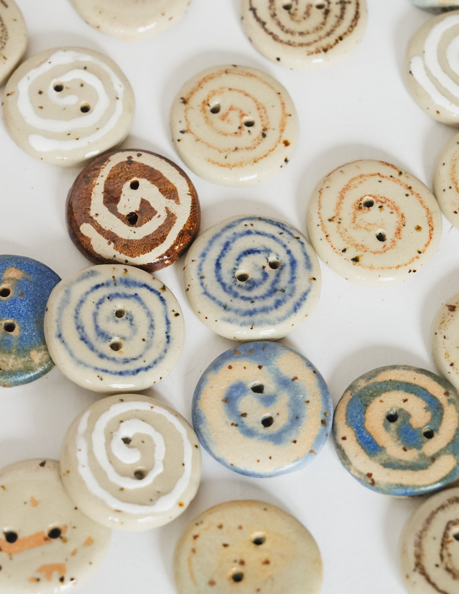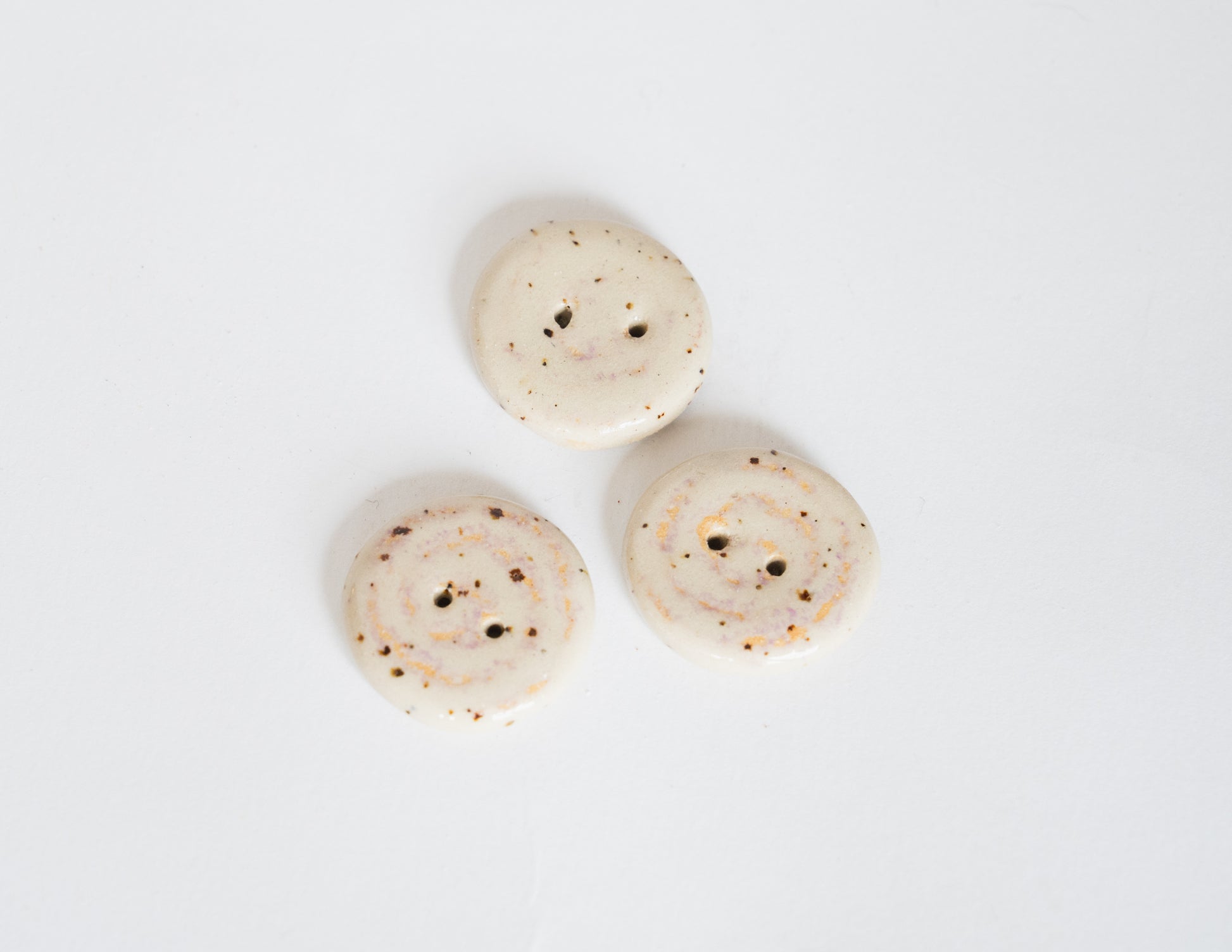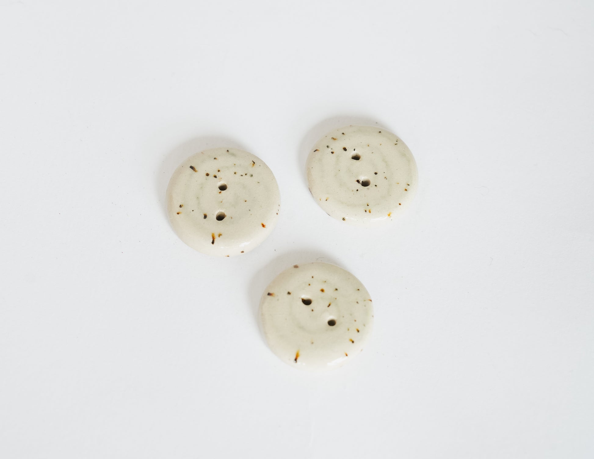 A classic round button with a hand-drawn swirl, glazed in clear over speckled beige stoneware. Each swirl carries subtle differences in rhythm and line. A soft accent for cardigans, project bags, or delicate closures.