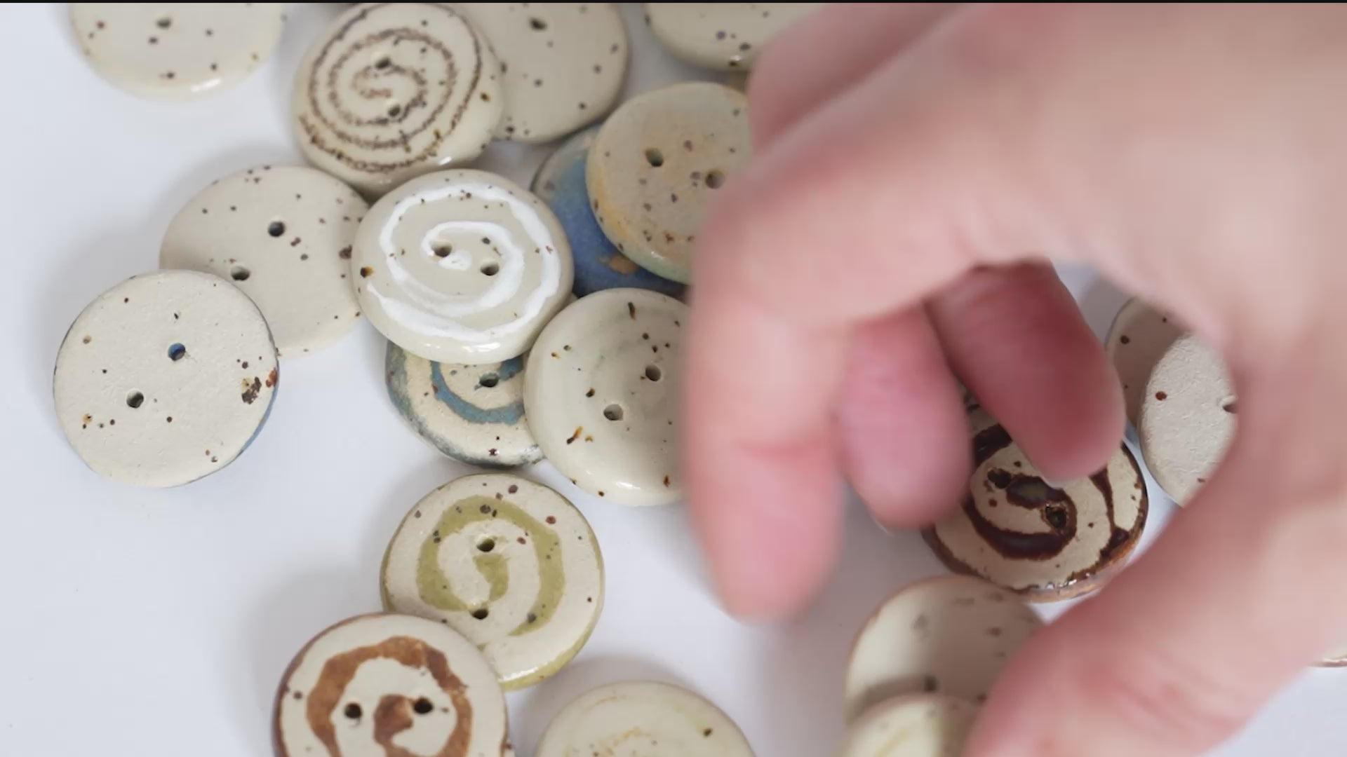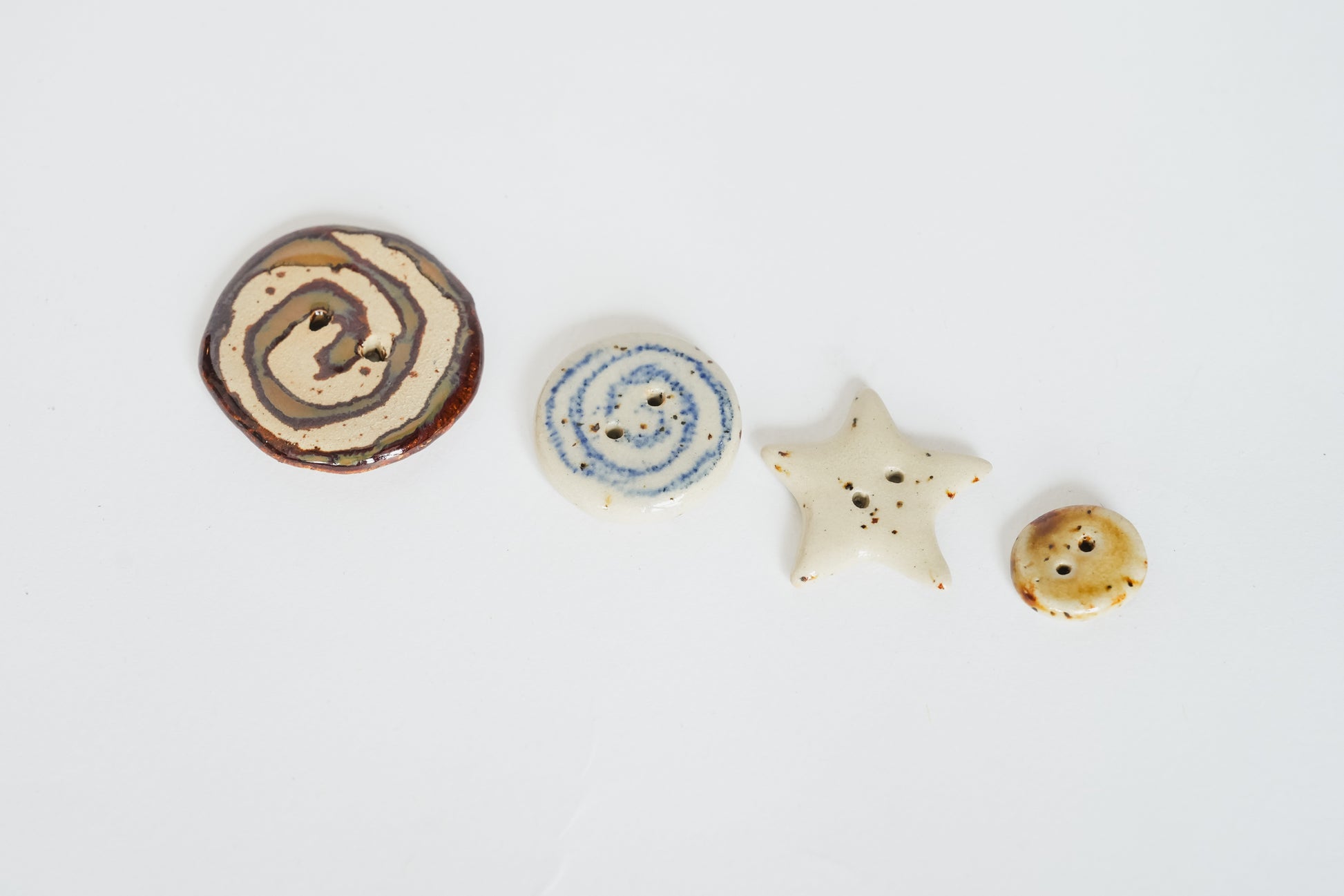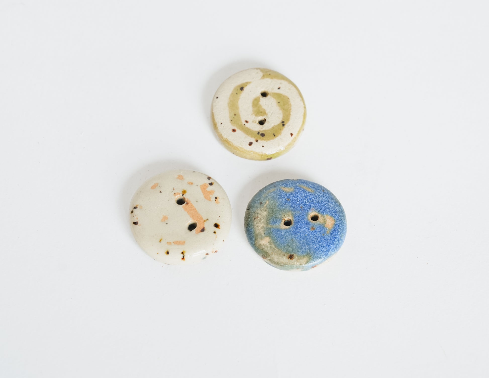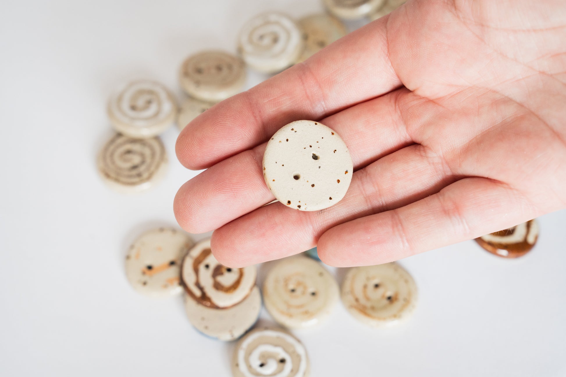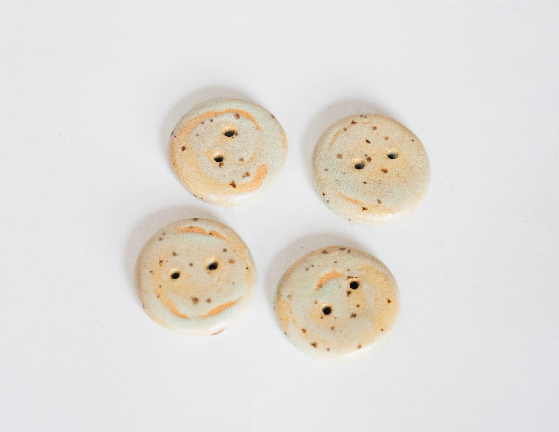 A classic round button with a hand-drawn swirl, glazed in clear over speckled beige stoneware. Each swirl carries subtle differences in rhythm and line. A soft accent for cardigans, project bags, or delicate closures.