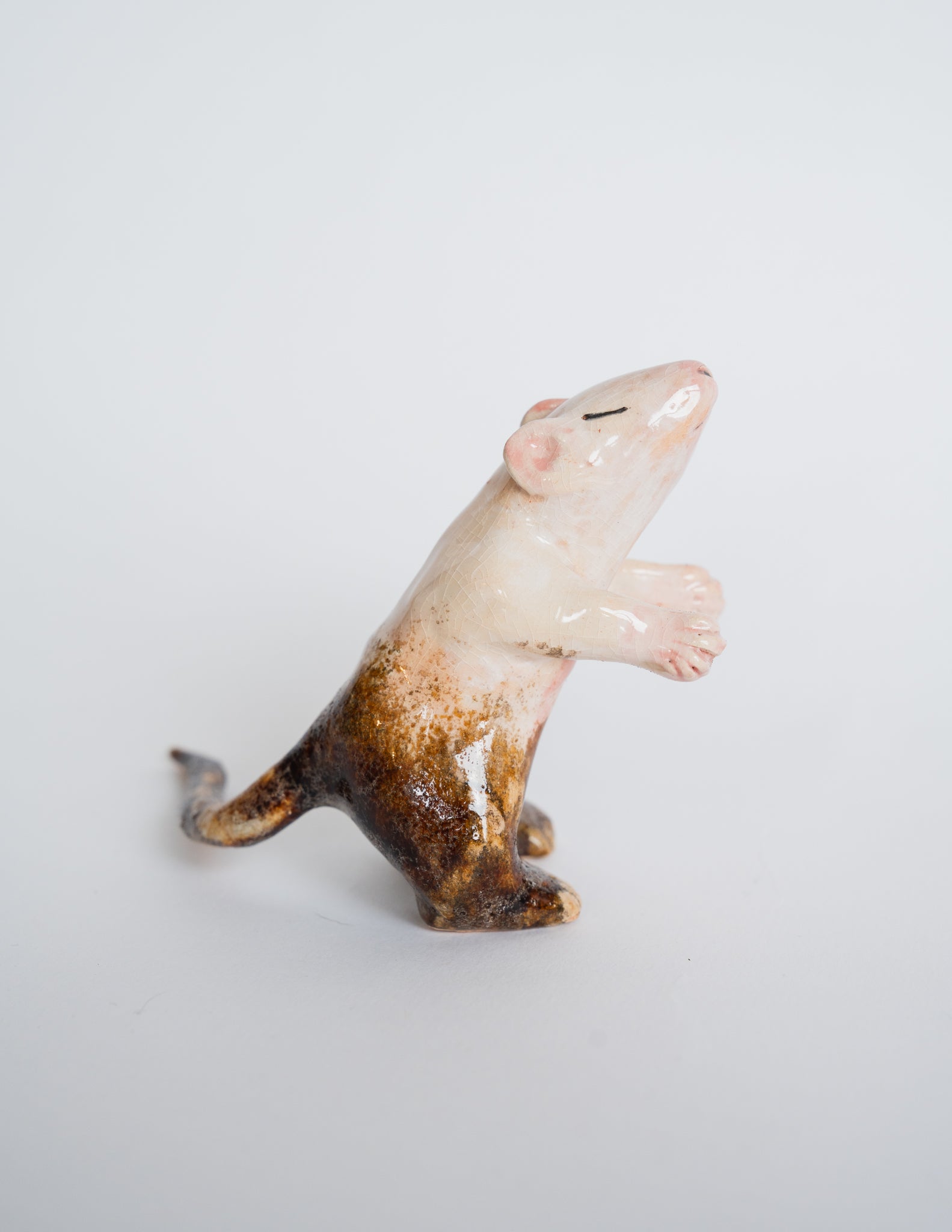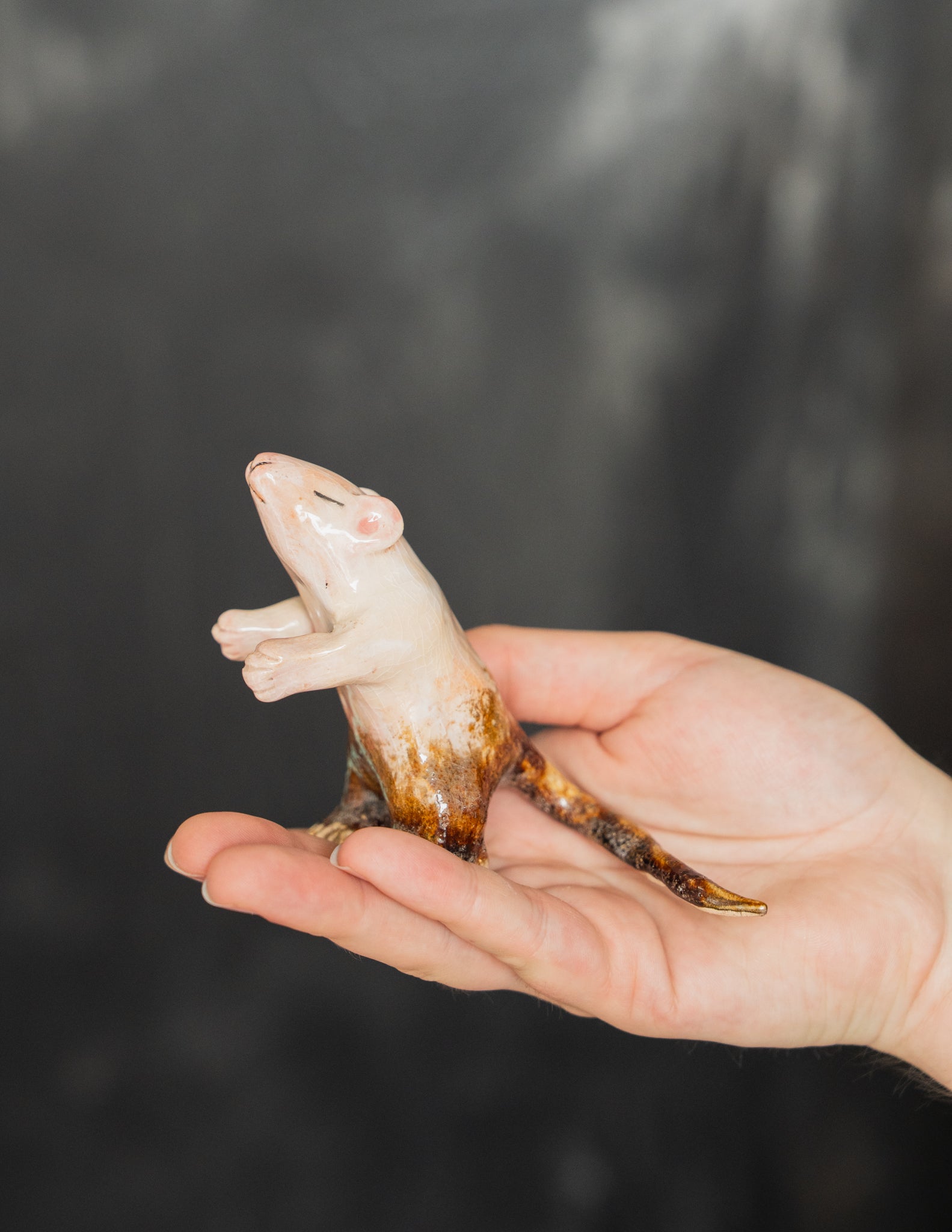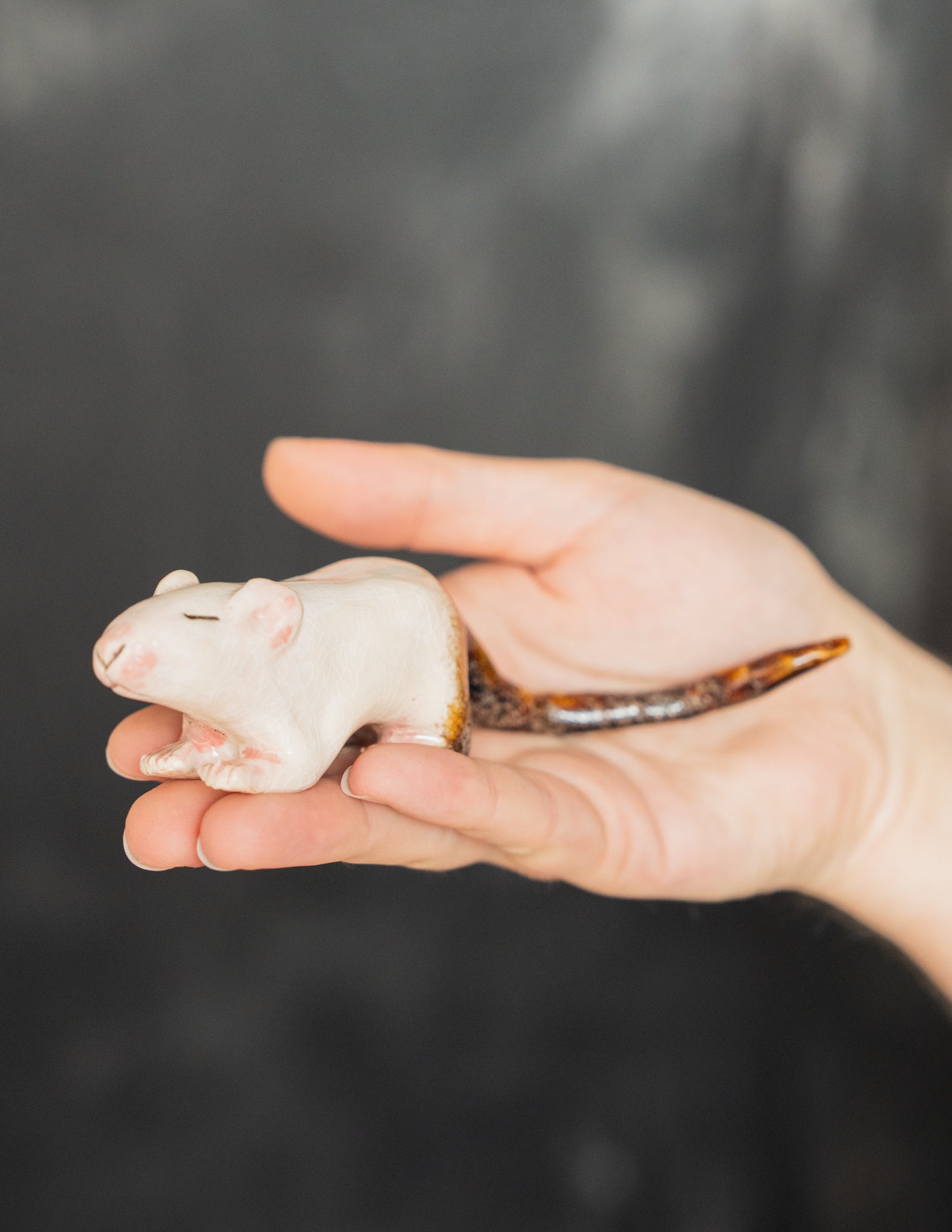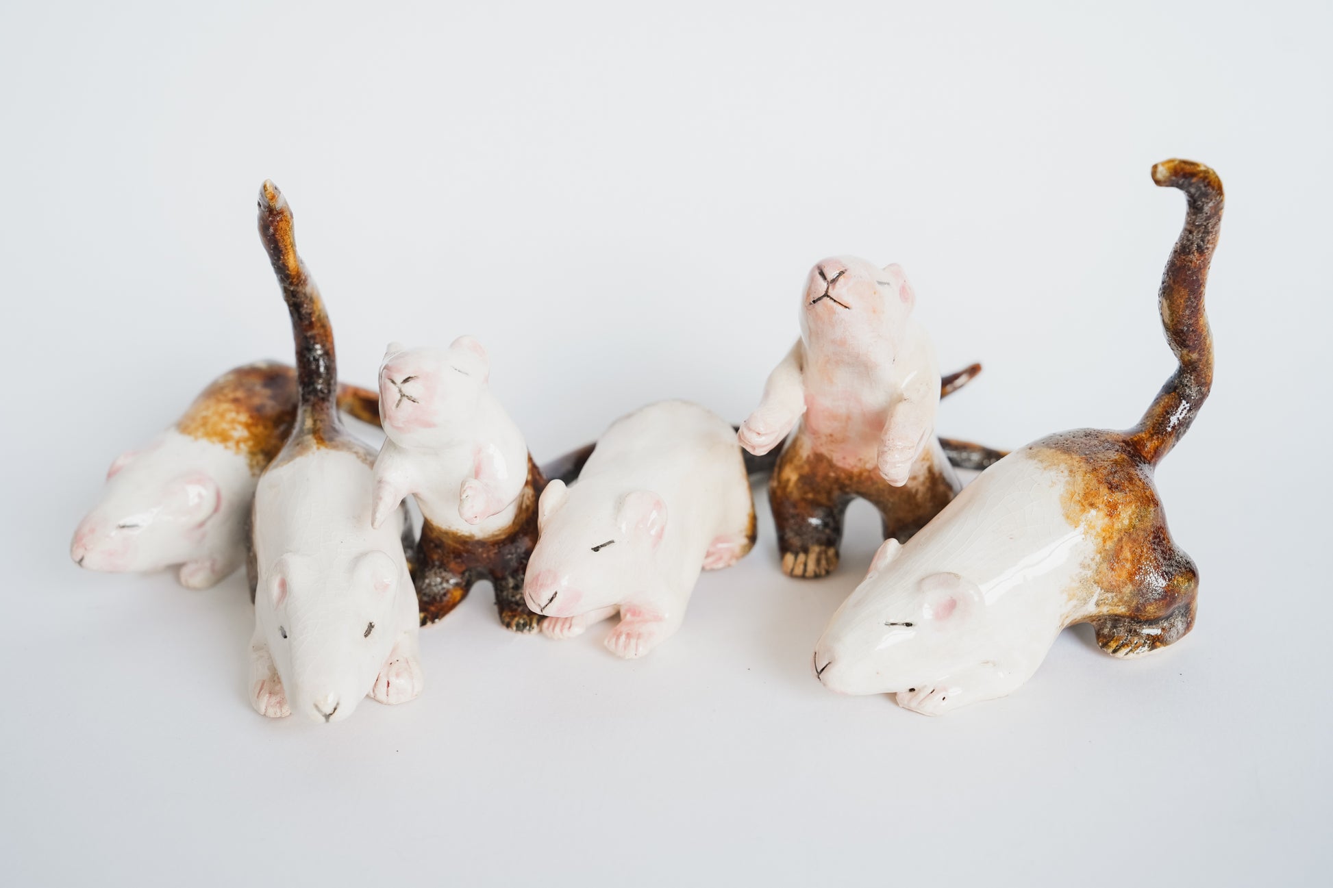 In Jewish mythology, mudmice were said to arise from the edge of creation. They are creatures formed from half earth and half flesh, born of spontaneous generation in swampy ground. These sculptural mudmice are handmade from earthenware clay, strange and sweet and silent, with tails curled and ears perked as if listening.