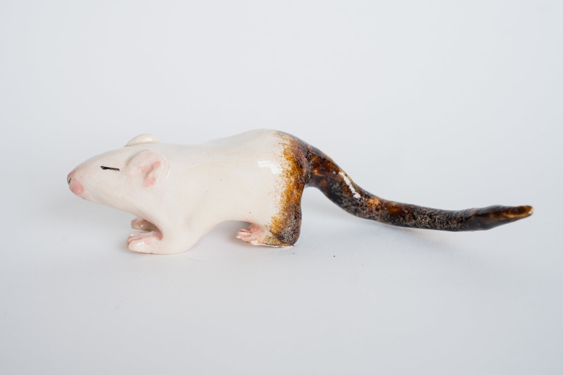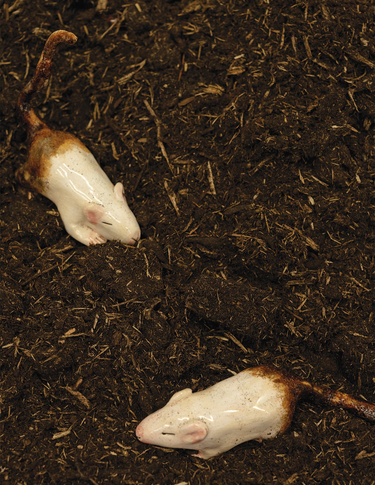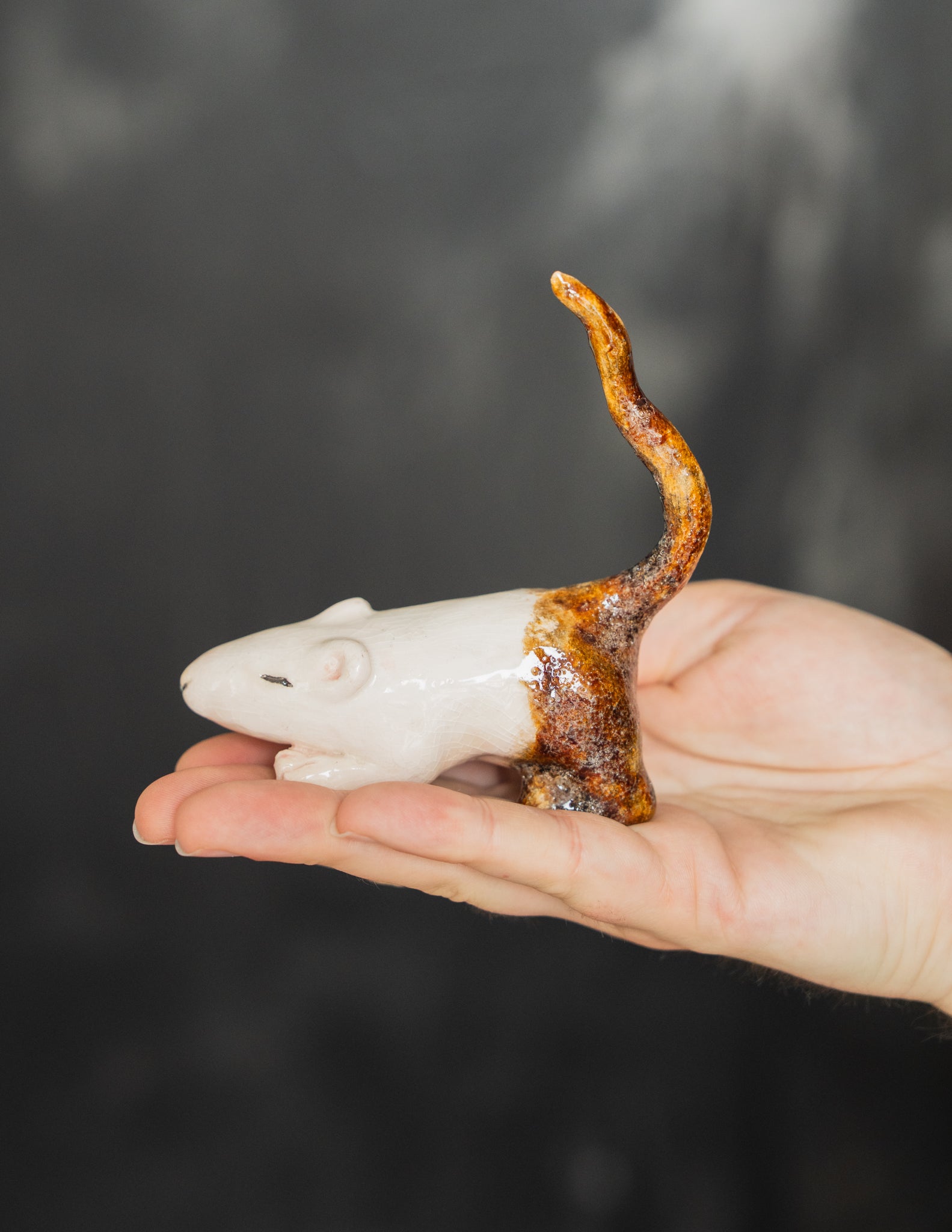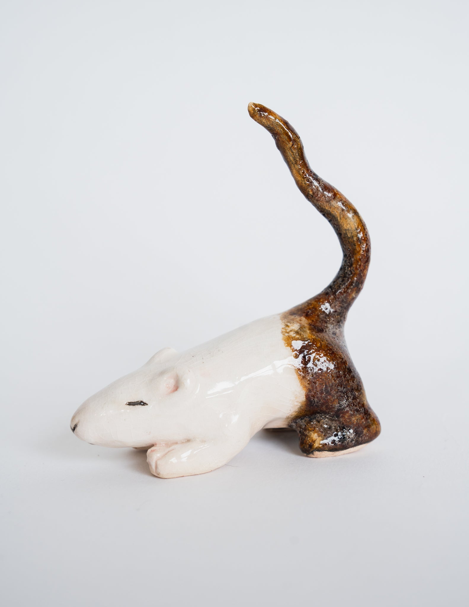 In Jewish mythology, mudmice were said to arise from the edge of creation. They are creatures formed from half earth and half flesh, born of spontaneous generation in swampy ground. These sculptural mudmice are handmade from earthenware clay, strange and sweet and silent, with tails curled and ears perked as if listening.