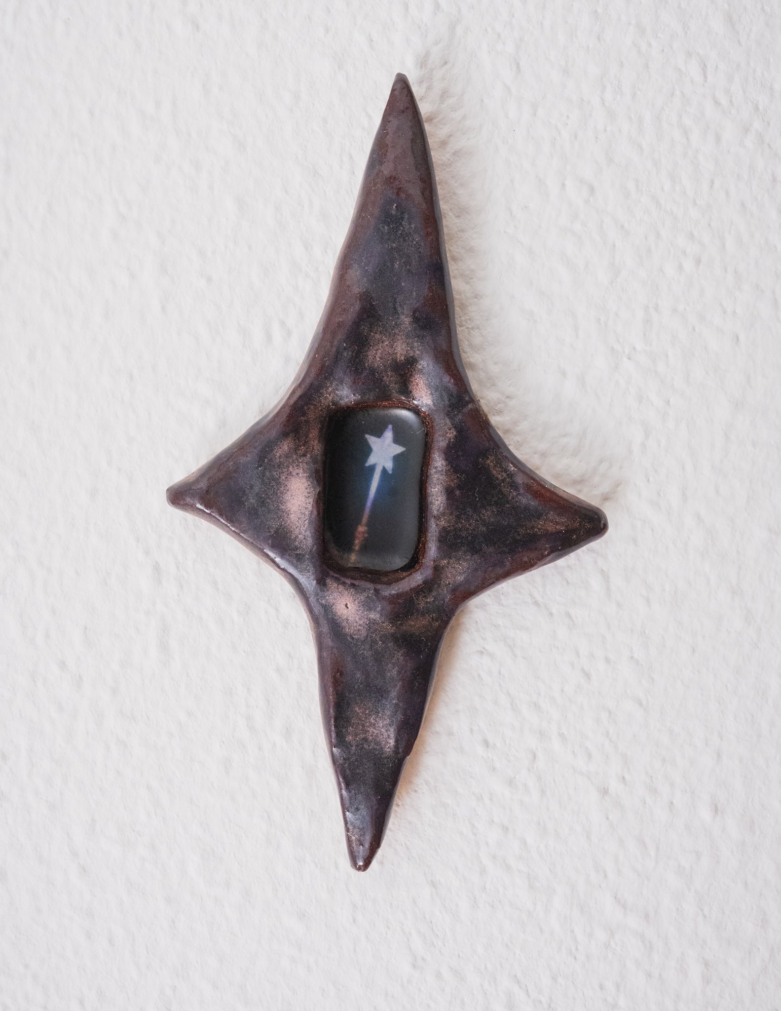 Forever Frame in the shape of a four point star, with encapsulated image of a bedazzled magical wand. The photograph originates from the multimedia project Fever Dreams of a Hermit, 2022.
